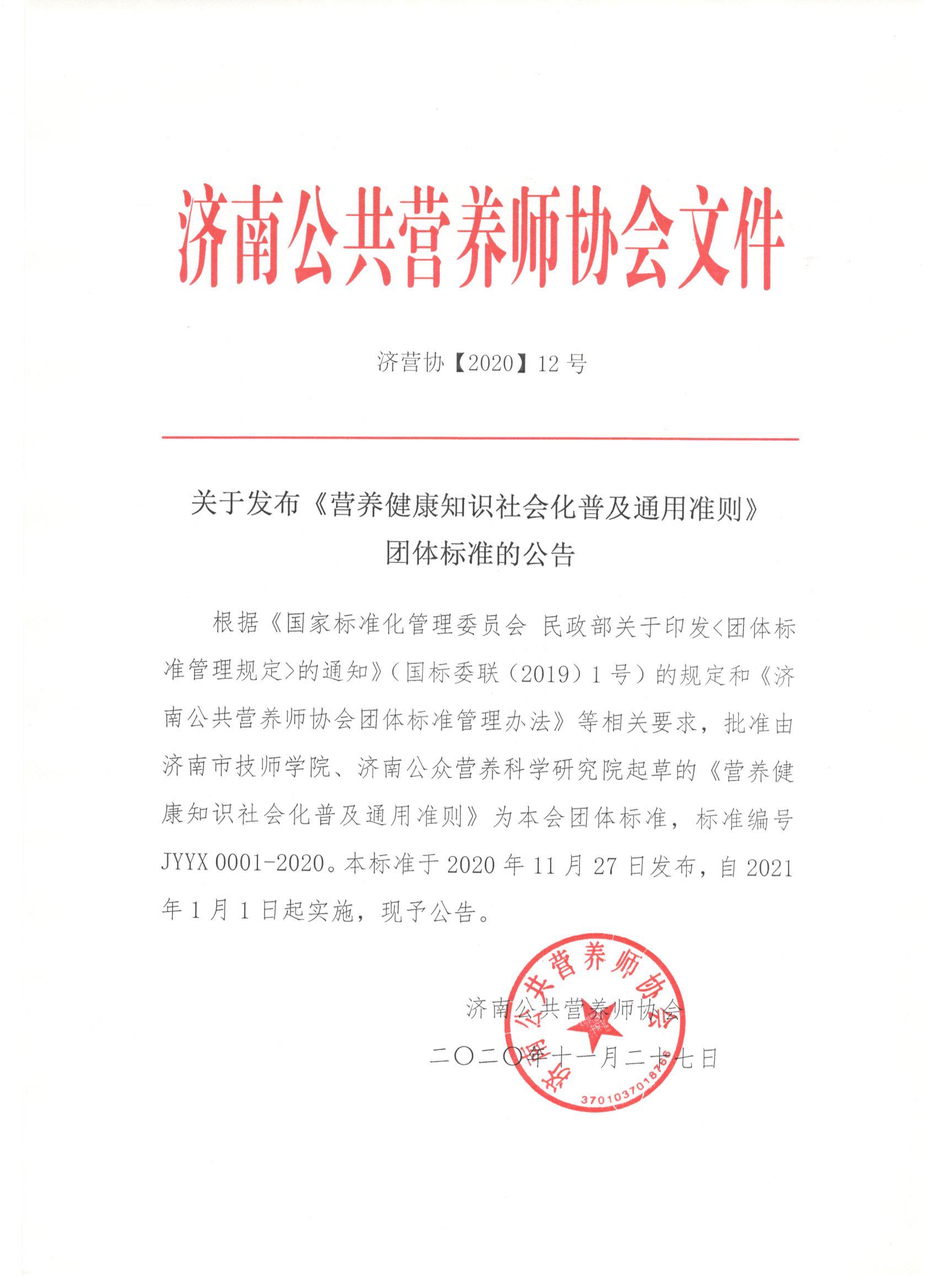 根据《国家标准化管理委员会 民政部关于印发<团体标准管理规定>的通知》(国标委联(2019)1号)的规定和《济南公共营养师协会团体标准管理办法》等相关要求,批准由济南市技师学院、济南公众营养科学研究院起草的《营养健康知识社会化普及通用准则》为本会团体标准,标准编号JYYX 0001-2020。本标准于2020年11月27日发布,自2021年1月1日起实施,现予公告。