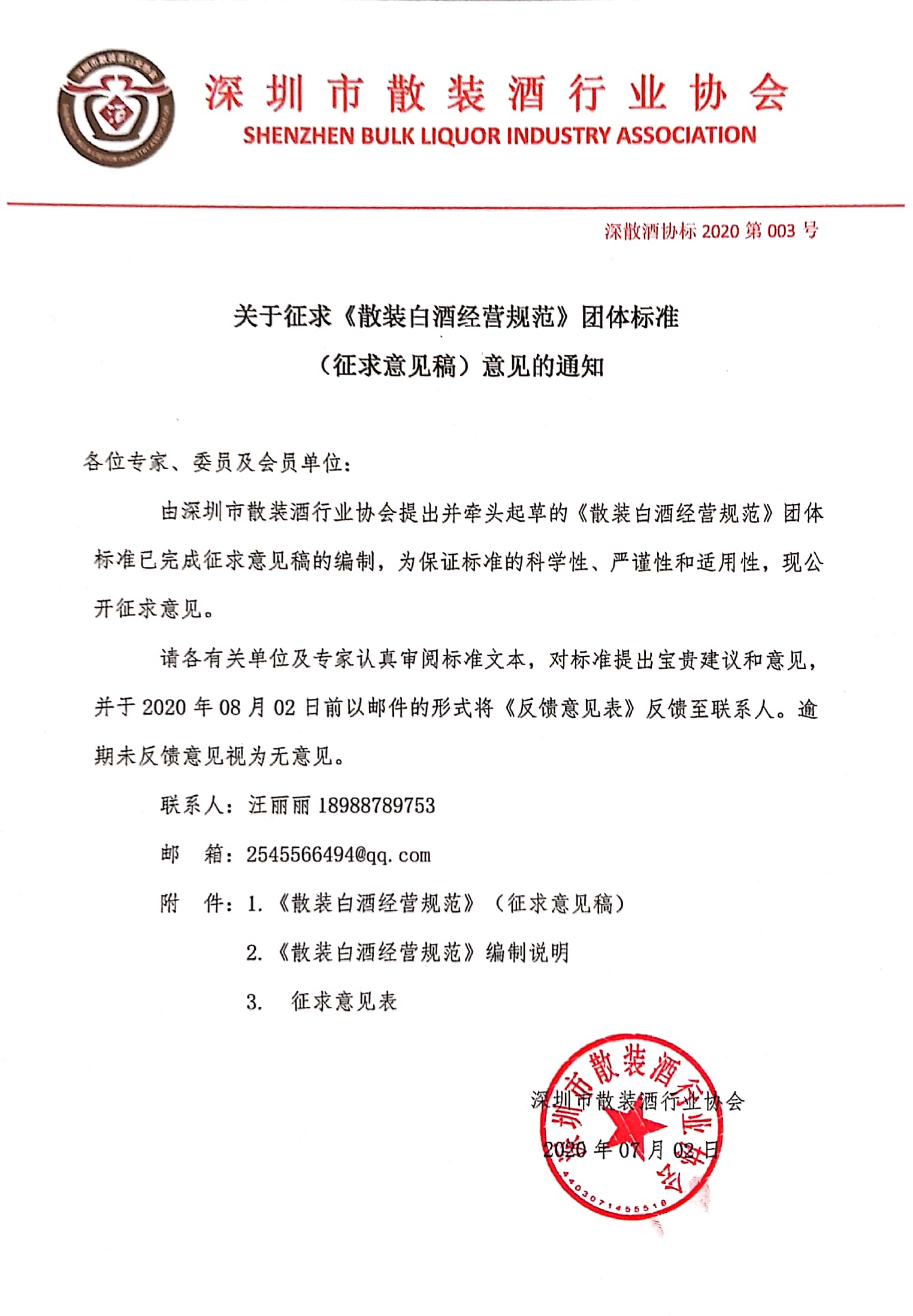 由深圳市散装酒行业协会提出并牵头起草的《散装白酒经营规范》团体标准已完成征求意见稿的编制,为保证标准的科学性、严谨性和适用性,现公开征求意见。