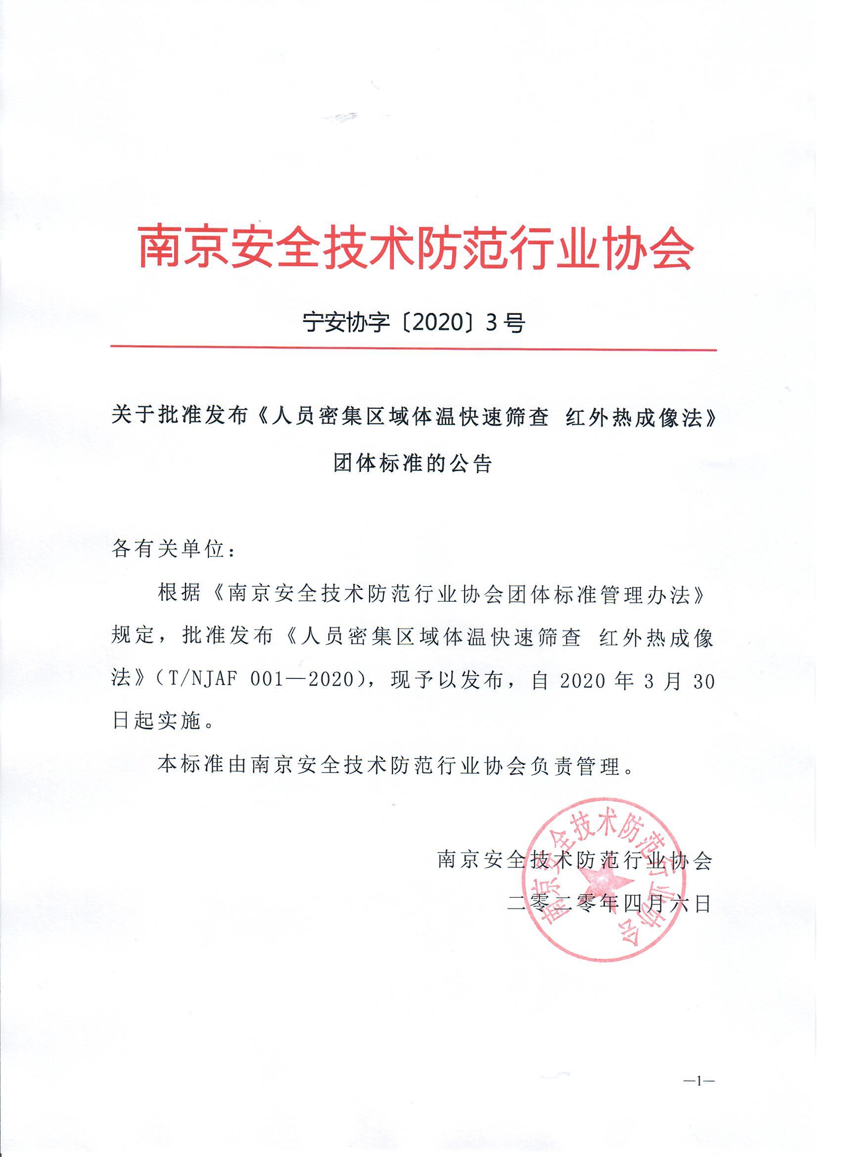 根据《南京安全技术防范行业协会团体标准管理办法》规定,现批准发布《人员密集区域体温快速筛查 红外热成像法》(T/NJAF 001-2020)。本标准于2020年3月30日发布并实施,现予公告。