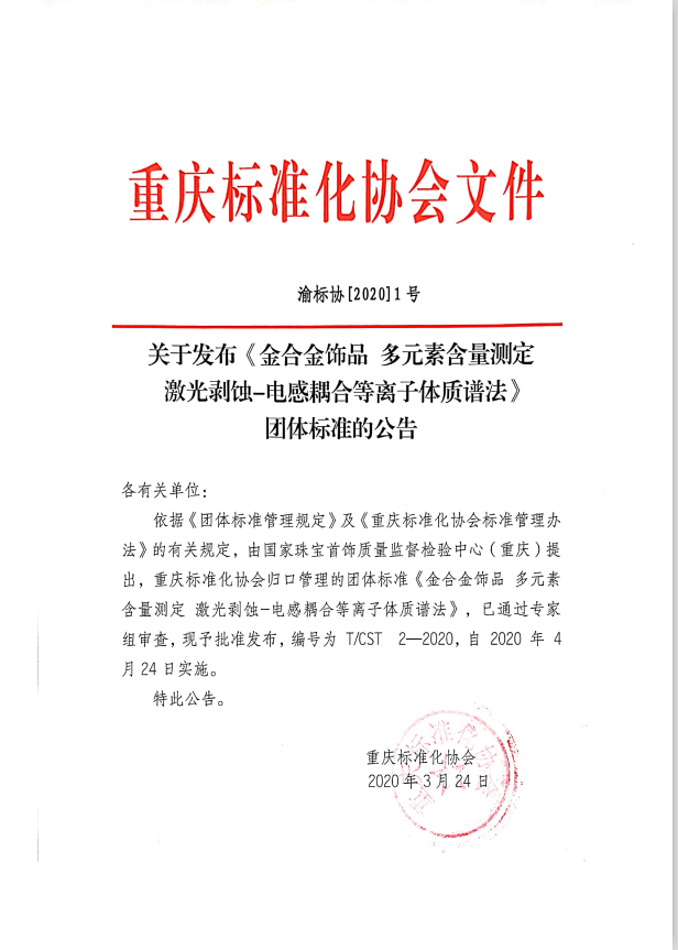 依据《团体标准管理规定》及《重庆标准化协会标准管理办法》的有关规定,由国家珠宝首饰质量监督检验中心(重庆)提出,重庆标准化协会归口管理的团体标准《金合金饰品 多元素含量测定 激光剥蚀-电感耦合等离子体质谱法》,已通过专家组审查,现予批准发布,编号为 T/CST 2—2020,自 2020 年 4 月24日实施。