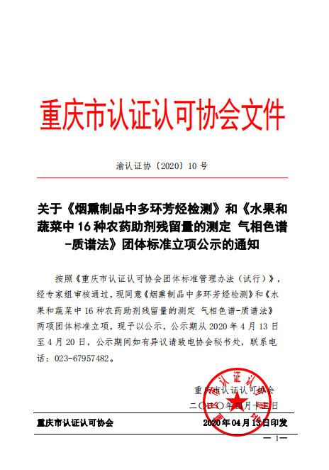 渝认证协〔2020〕10号关于《烟熏制品中多环芳烃检测》和《水果和蔬菜中16种农药助剂残留量的测定 气相色谱-质谱法》团体标准立项公示的通知.png