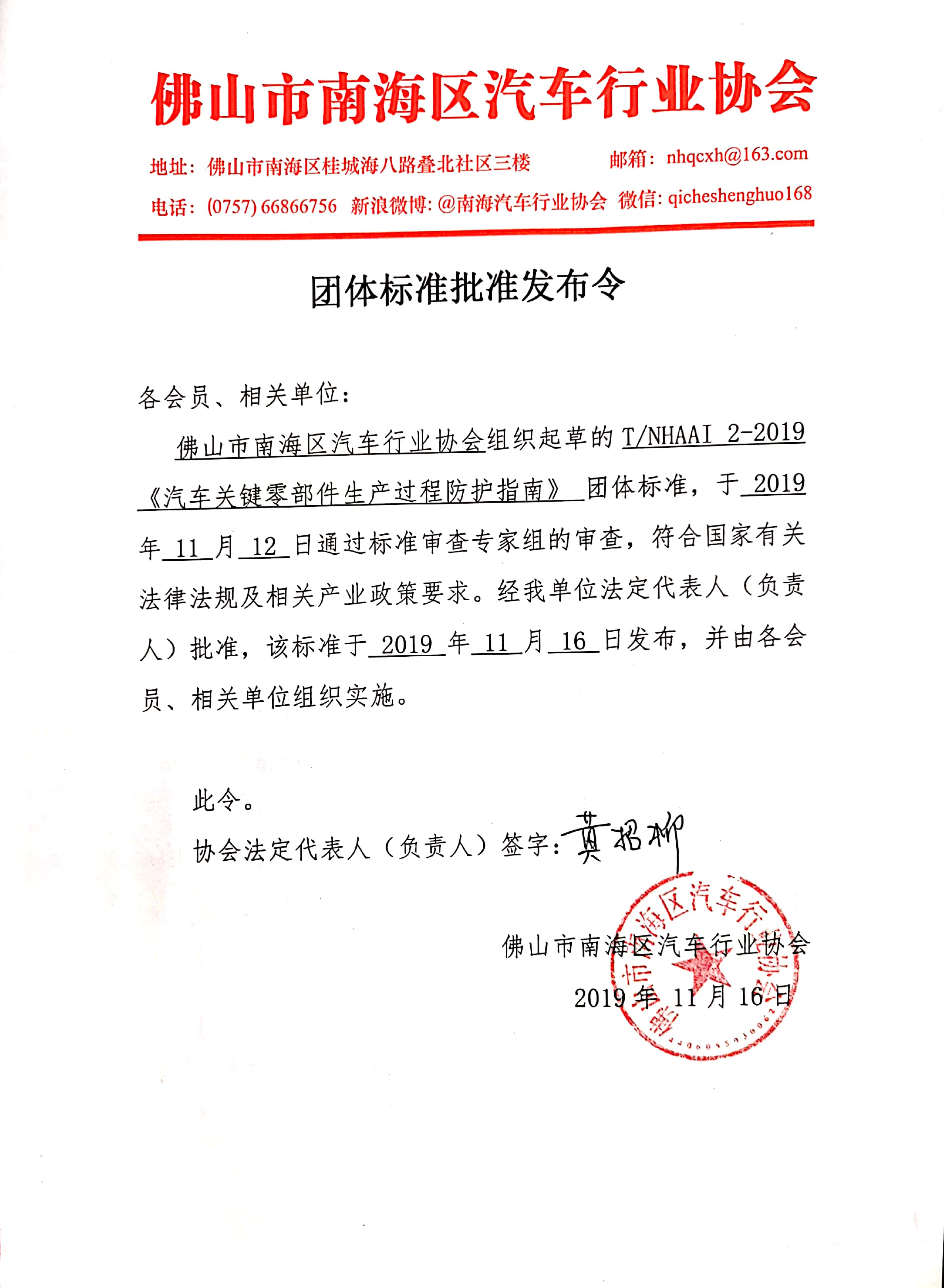 佛山市南海区汽车行业协会组织起草的T/NHAAI 2-2019《汽车关键零部件生产过程防护指南》 团体标准,于 2019 年 11 月 12 日通过标准审查专家组的审查,符合国家有关法律法规及相关产业政策要求。经我单位法定代表人(负责人)批准,该标准于 2019 年 11 月 16 日发布,并由各会员、相关单位组织实施。