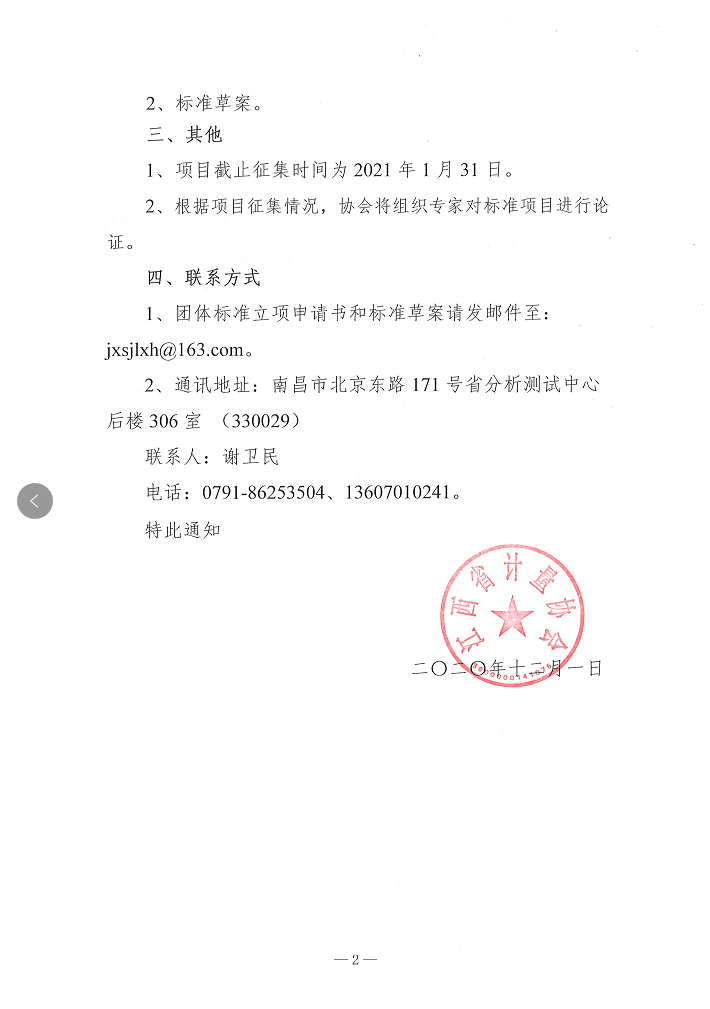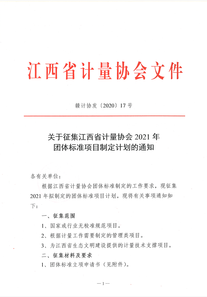 根据江西省计量协会团体标准制定的工作要求,现征集2021年拟制定的团体标准项目计划。现将有关事项通知如下: