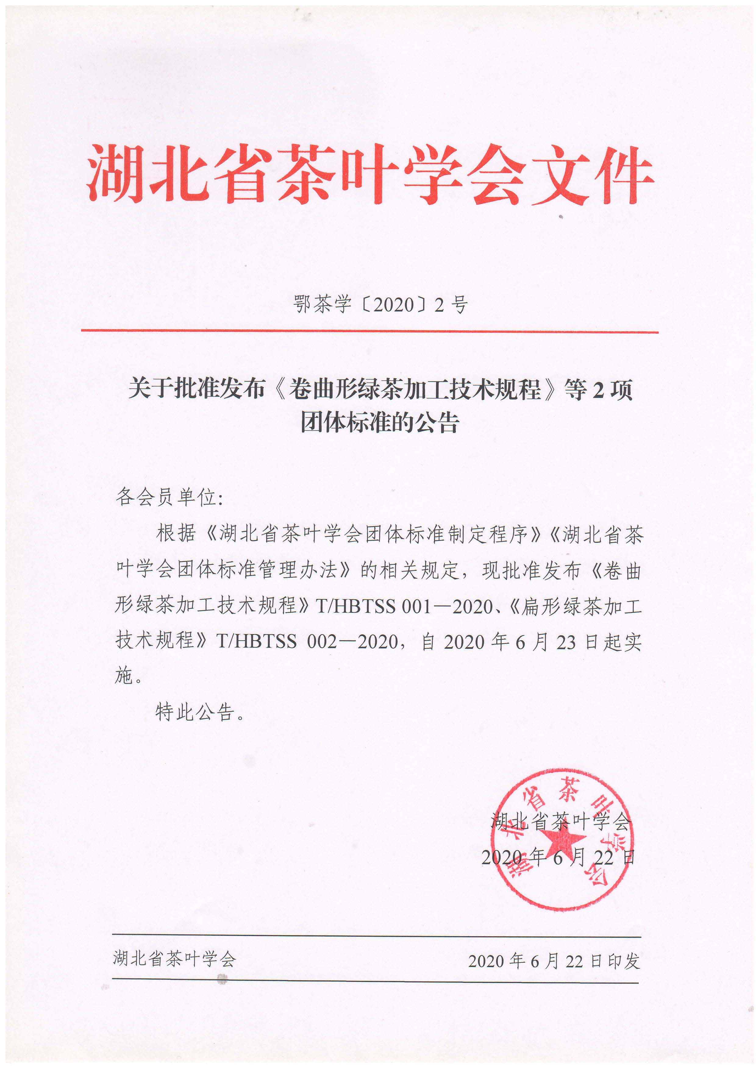 根据《湖北省茶叶学会团体标准制定程序》《湖北省茶叶学会团体标准管理办法》的相关规定,现批准发布《卷曲形绿茶加工技术规程》T/HBTSS 001-2020、《扁形绿茶加工技术规程》T/HBTSS 002-2020,自2020年6月23日起实施。
