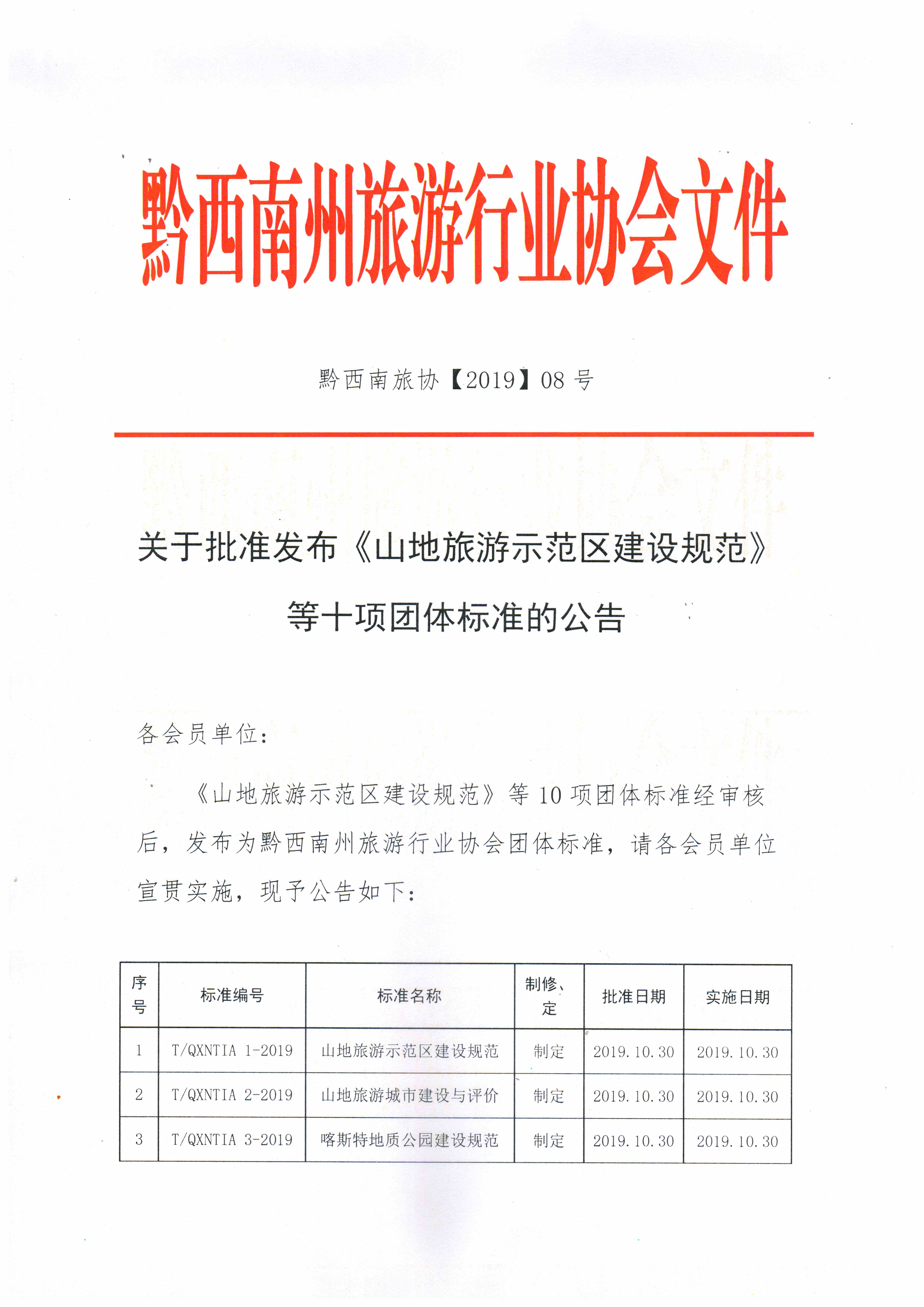 《山地旅游示范区建设规范》等10项团体标准经审核后,发布为黔西南州旅游行业协会团体标准,请各会员单位宣贯实施,现予公告如下: