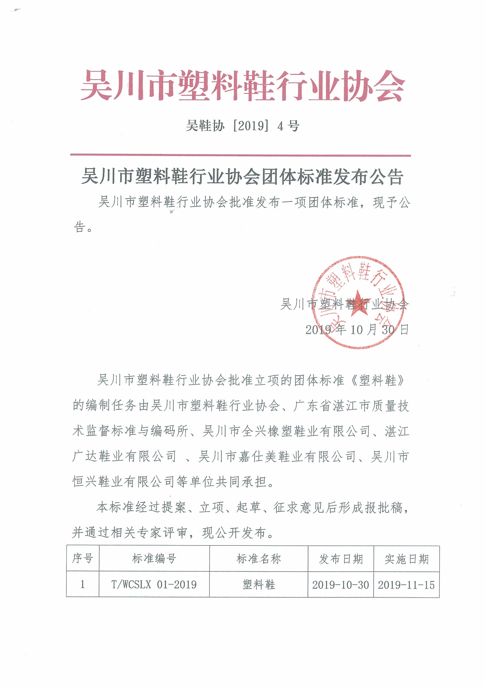 吴川市塑料鞋行业协会批准发布一项团体标准,现予公告。