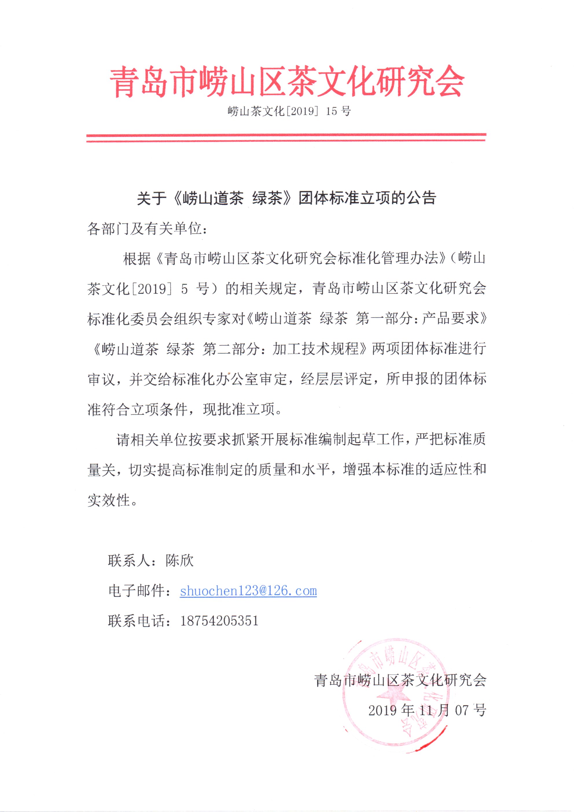 根据《青岛市崂山区茶文化研究会标准化管理办法》(崂山茶文化[2019] 5 号)的相关规定,青岛市崂山区茶文化研究会标准化委员会组织专家对《崂山道茶 绿茶 第一部分:产品要求》《崂山道茶 绿茶 第二部分:加工技术规程》两项团体标准进行审议,并交给标准化办公室审定,经层层评定,所申报的团体标准符合立项条件,现批准立项。