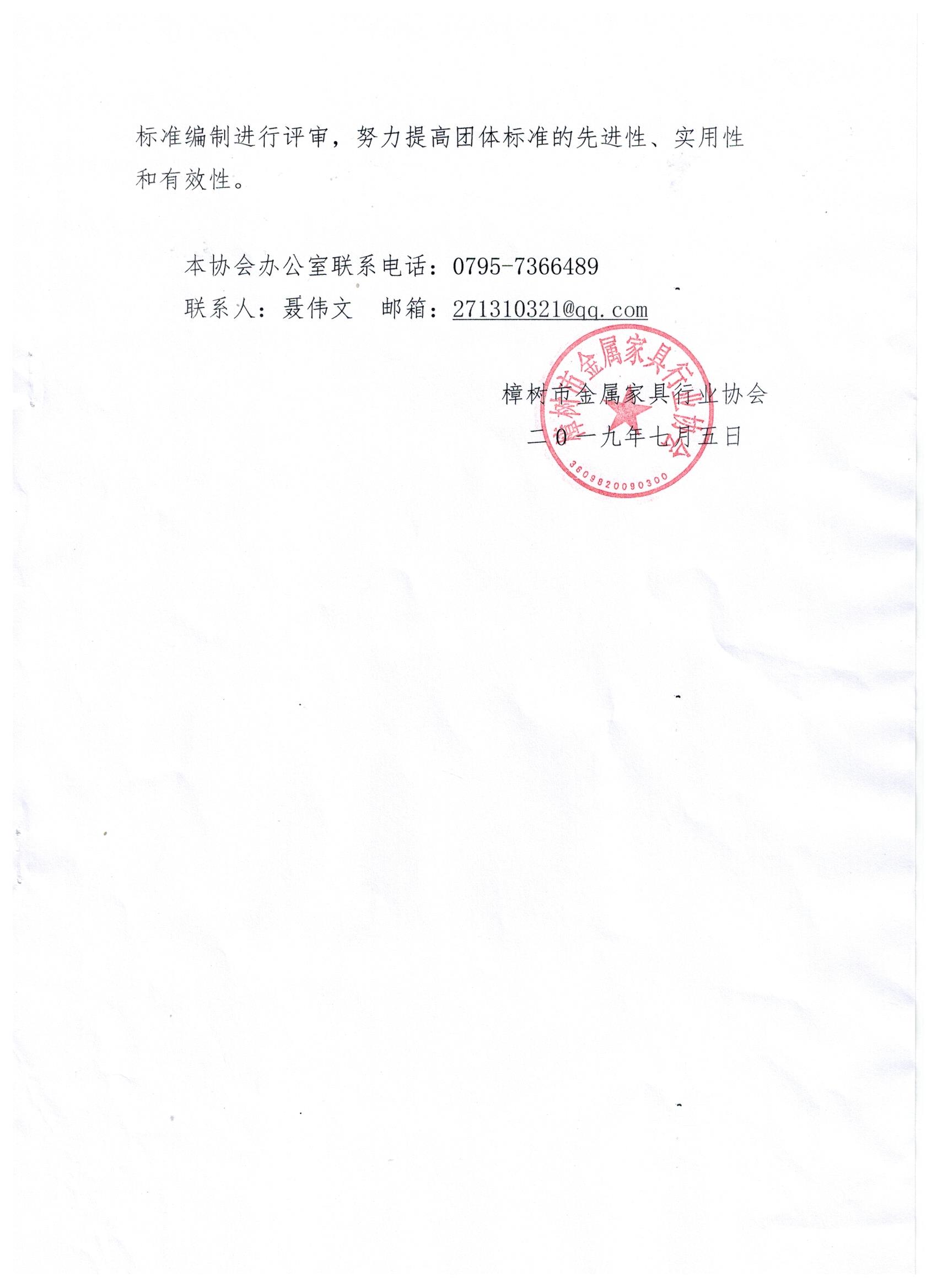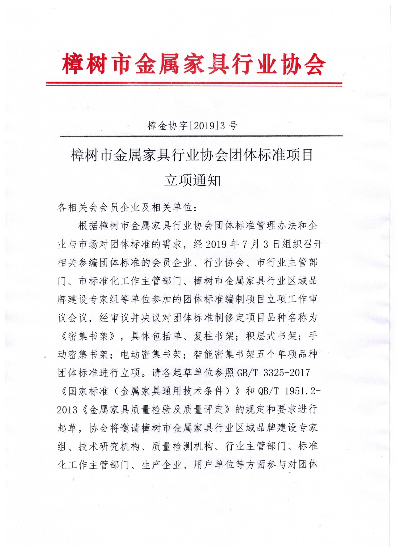 根据樟树市金属家具行业协会团体标准管理办法和企业与市场对团体标准的需求,经2019年7月3日组织召开相关参编团体标准的会员企业、行业协会、市行业主管部门、市标准化工作主管部门、樟树市金属家具行业区域品牌建设专家组等单位参加的团体标准编制项目立项工作审议会议,经审议并决议对团体标准制修定项目品种名称为《密集书架》,具体包括单、复柱书架;积层式书架;手动密集书架;电动密集书架;智能密集书架五个单项品种团体标准进行立项。请各起草单位参照GB/T 3325-2017《国家标准(金属家具通用技术条件)》和QB/T 1951.2-2013《金属家具质量检验及质量评定》的规定和要求进行起草,协会将邀请樟树市金属家具行业区域品牌建设专家组、技术研究机构、质量检测机构、行业主管部门、标准化工作主管部门、生产企业、用户单位等方面参与对团体标准编制进行评审,努力提高团体标准的先进性、实用性和有效性。