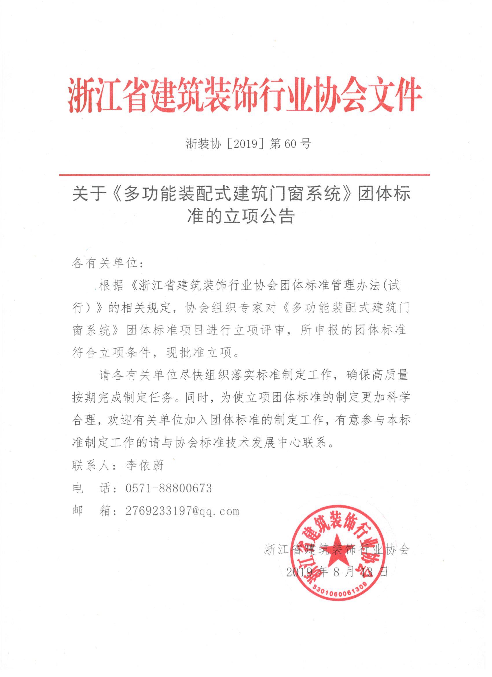 根据《浙江省建筑装饰行业协会团体标准管理办法(试行)》的相关规定,协会组织专家对《多功能装配式建筑门窗系统》团体标准项目进行立项评审,所申报的团体标准符合立项条件,现批准立项。