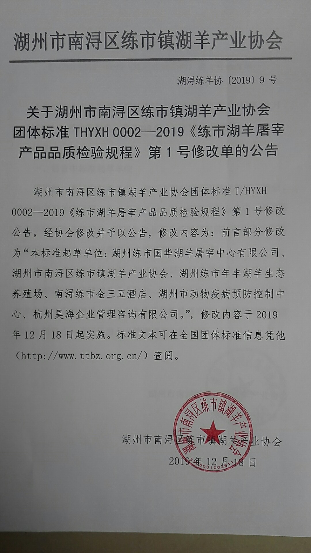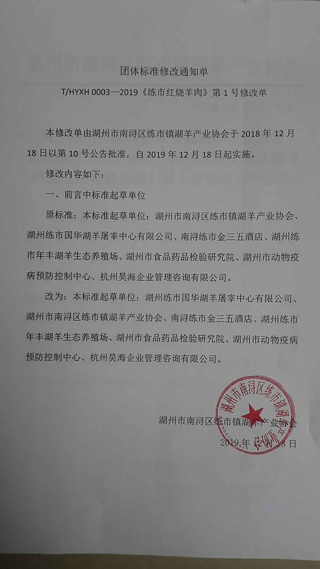 THYXH 0003—2019《练市红烧羊肉》第1号修改单经我团体审查批准发布。建议该修改单于2019年12月18日起实施。