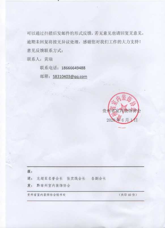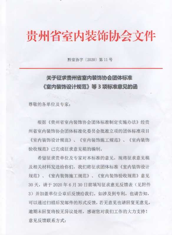 根据《贵州省室内装饰协会团体标准制定实施办法》有关规定,由生活家(北京)家居装饰有限公司贵阳分公司、贵州喜百年装饰工程有限公司、云南创艺装饰工程集团贵州公司、贵州宏程黔晟装饰工程监理服务有限公司、贵州织巢人产业发展股份有限公司等单位牵头起草的《室内装饰设计规范》、《室内装饰施工规范》、《室内装饰验收规范》3项团体标准,已完成标准征求意见稿,现向社会公开征集意见。