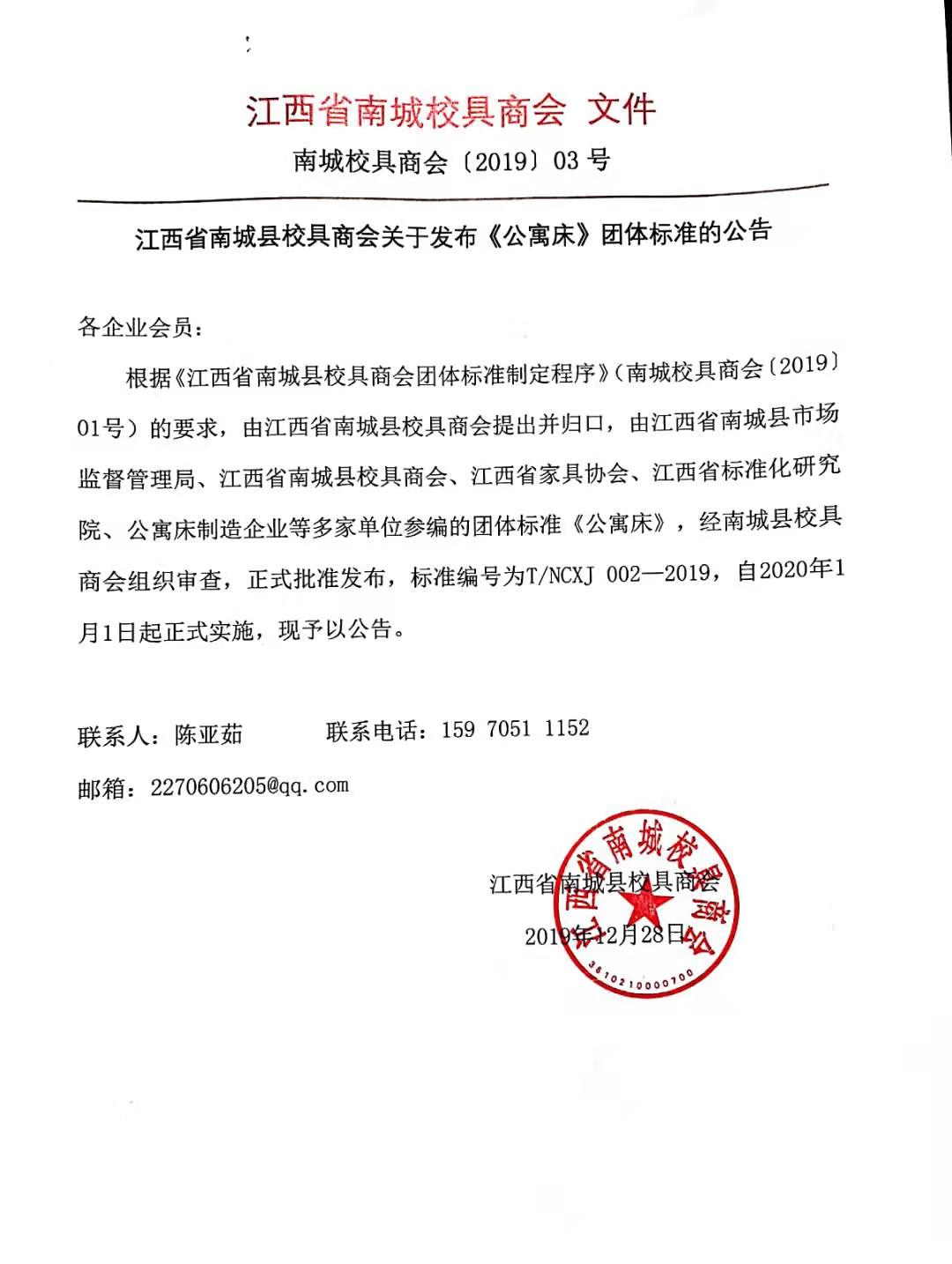 根据《南城县校具商会团体标准制定程序》的规定,现批准发布团体标准《公寓床》(T/NCXJ 002-2020)。