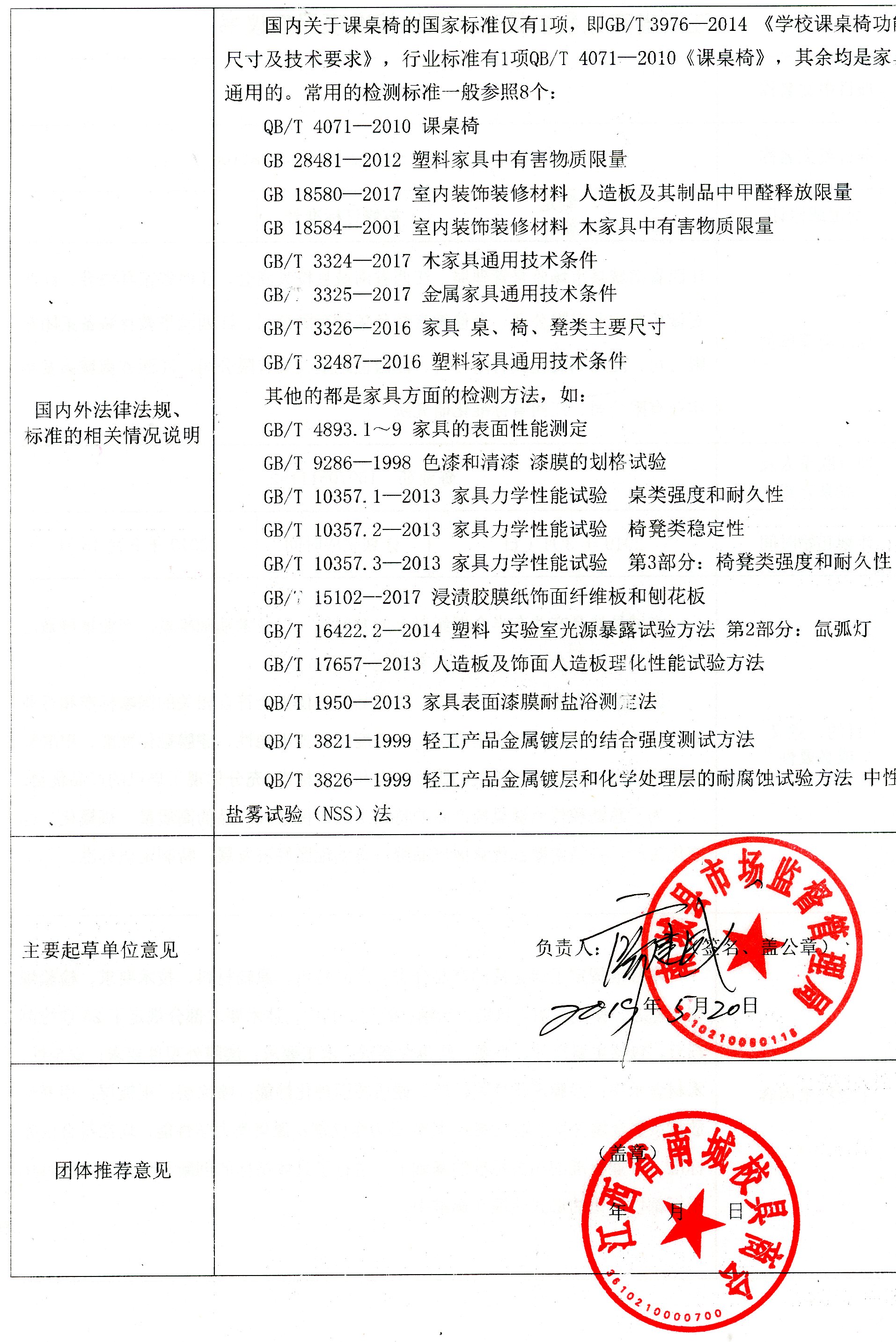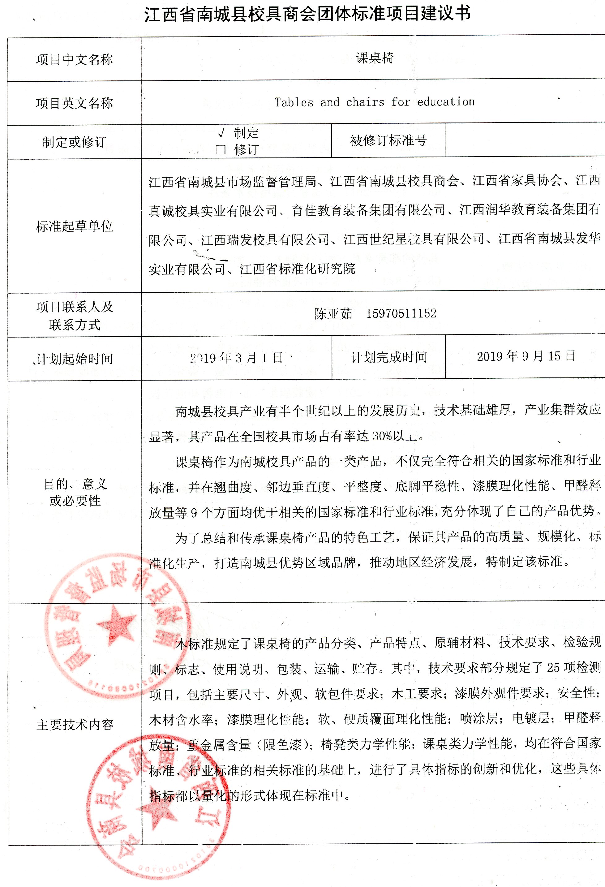 经江西省南城县校具商会预研、审查,第一个团体标准《课桌椅》正式立项,标准计划编号为T/NCXJ 001-2019,标准牵头单位为南城县市场监督管理局,特此公告。