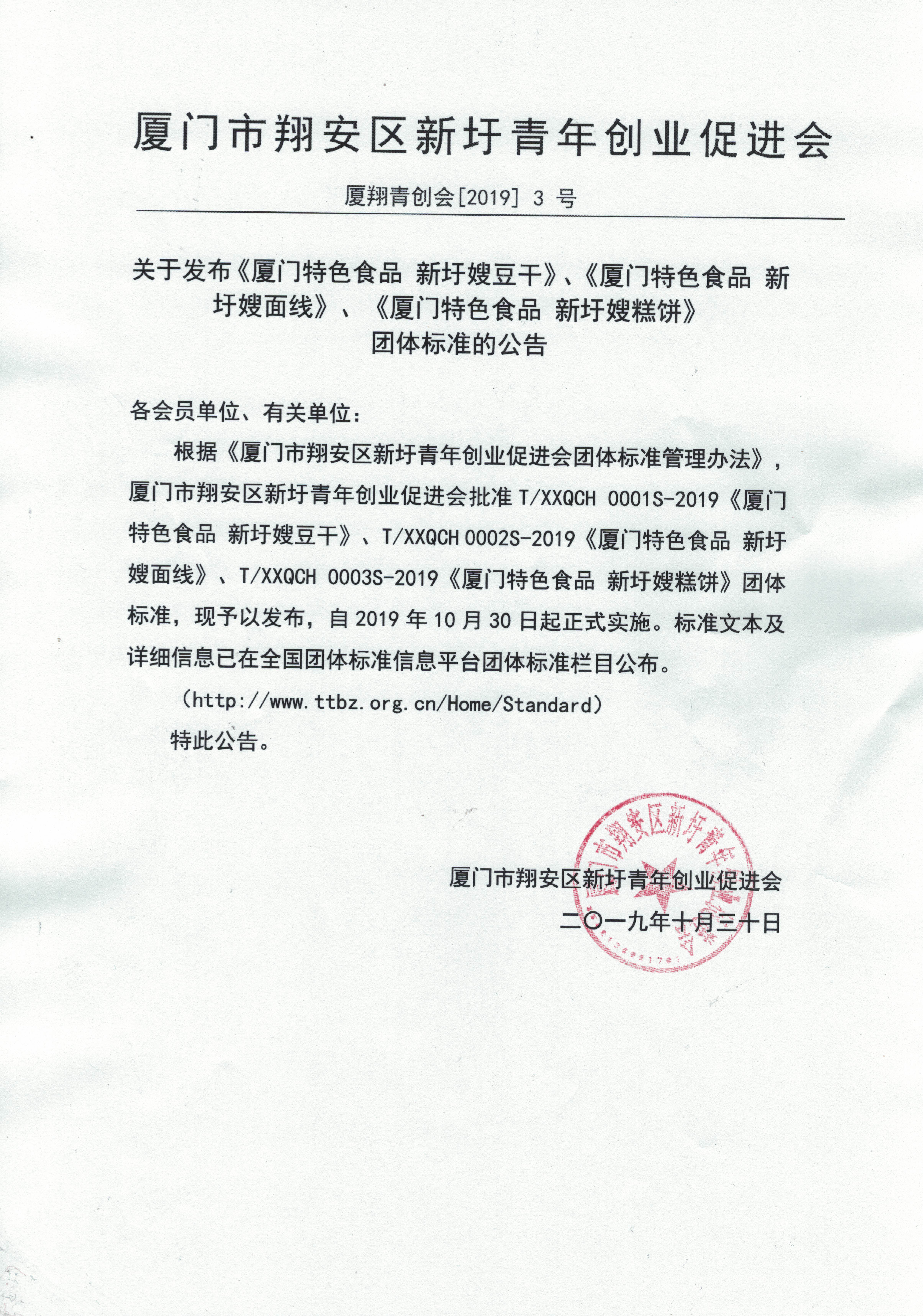 根据《厦门市翔安区新圩青年创业促进会团体标准管理办法》,厦门市翔安区新圩青年创业促进会批准T/XXQCH 0001S-2019《厦门特色食品 新圩嫂豆干》、T/XXQCH 0002S-2019《厦门特色食品 新圩嫂面线》、T/XXQCH 0003S-2019《厦门特色食品 新圩嫂马蹄酥》团体标准,现予以发布,自2019年10月30日起正式实施。标准文本及详细信息已在全国团体标准信息平台团体标准栏目公布。