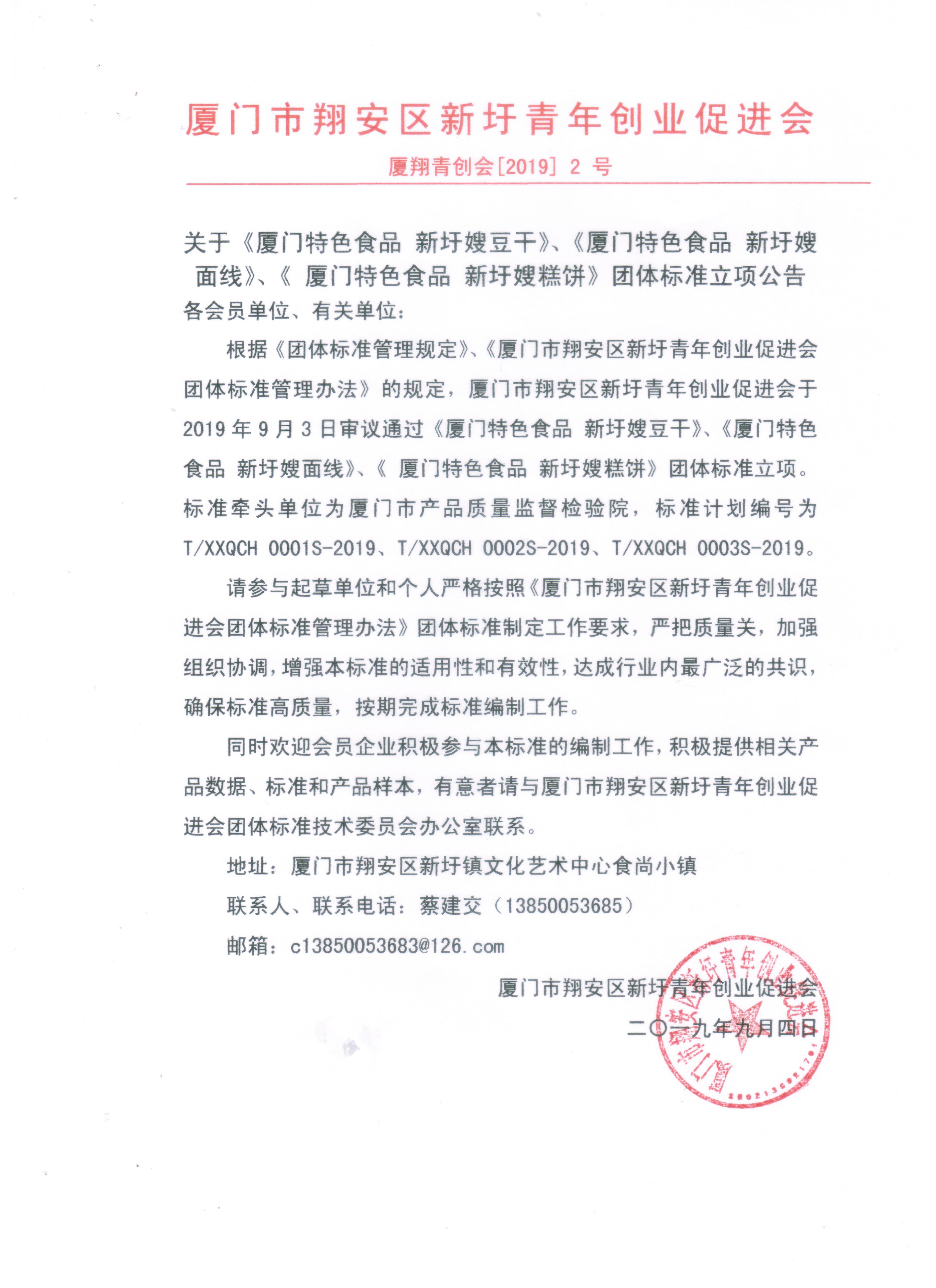 根据《团体标准管理规定》《厦门市翔安区新圩青年创业促进会团体标准管理办法》的规定,厦门市翔安区新圩青年创业促进会于2019年9月3日审议通过《厦门特色食品 新圩嫂豆干》《厦门特色食品 新圩嫂面线》《厦门特色食品 新圩嫂糕饼》团体标准立项。标准牵头单位为厦门市产品质量监督检验院,标准计划编号为T/XXQCH 0001S-2019、T/XXQCH 0002S-2019、T/XXQCH 0003S-2019。