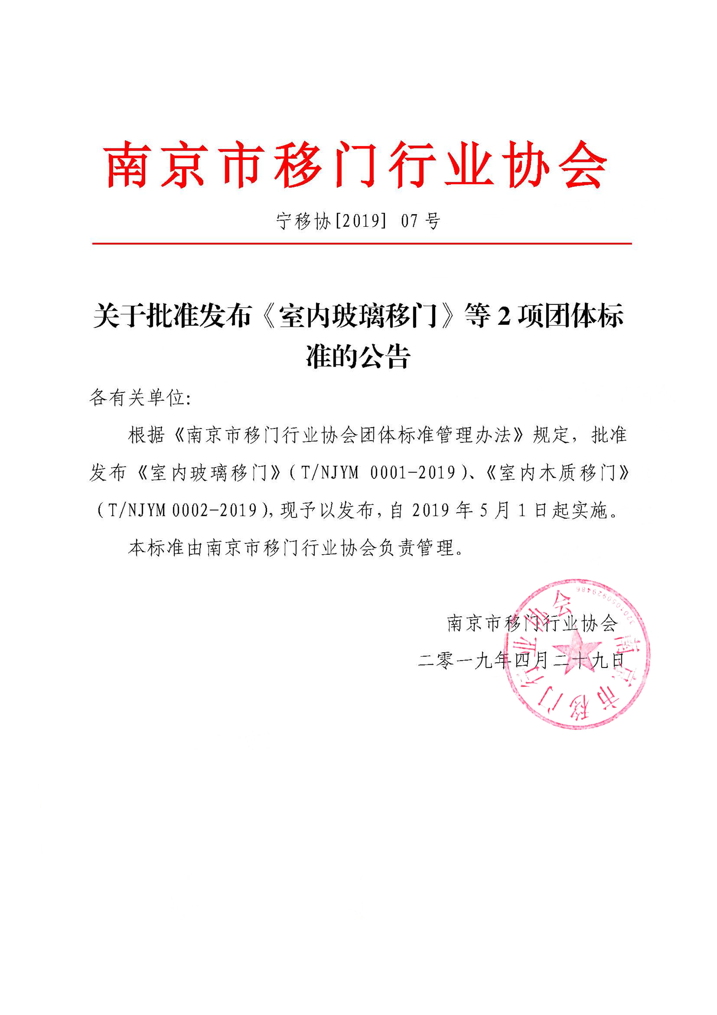 根据《南京市移门行业协会团体标准管理办法》的相关规定,南京市移门行业协会已组织有关方面完成《室内玻璃移门》(T/NJYM 0001-2019)、《室内木质移门》(T/NJYM 0002-2019)团体标准的制定工作,并批准正式发布。自2019年5月1日起实施。现予公告。