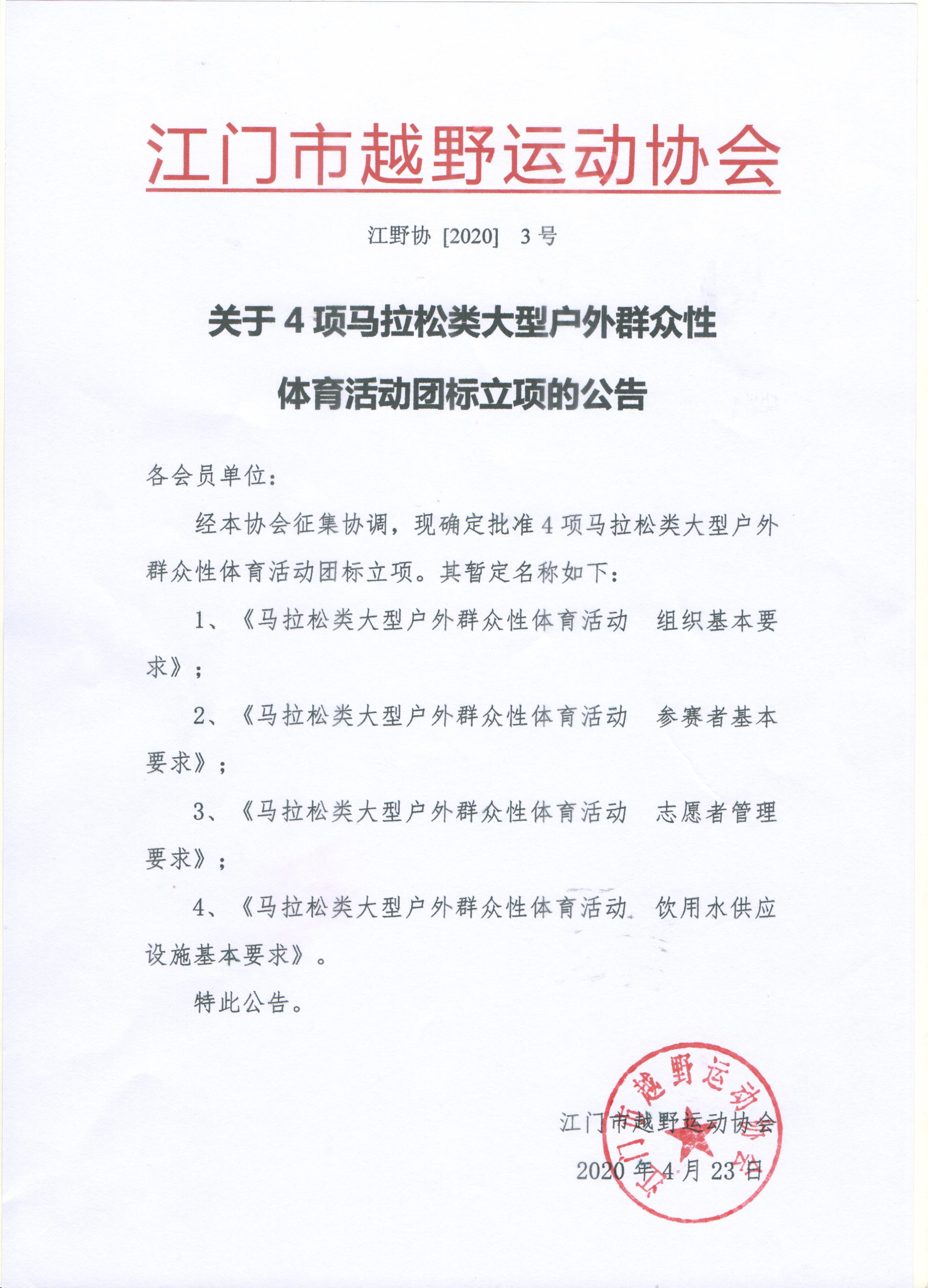江野协[2020]3号 关于4项马拉松类大型户外群众性体育活动团标立项的公告.png