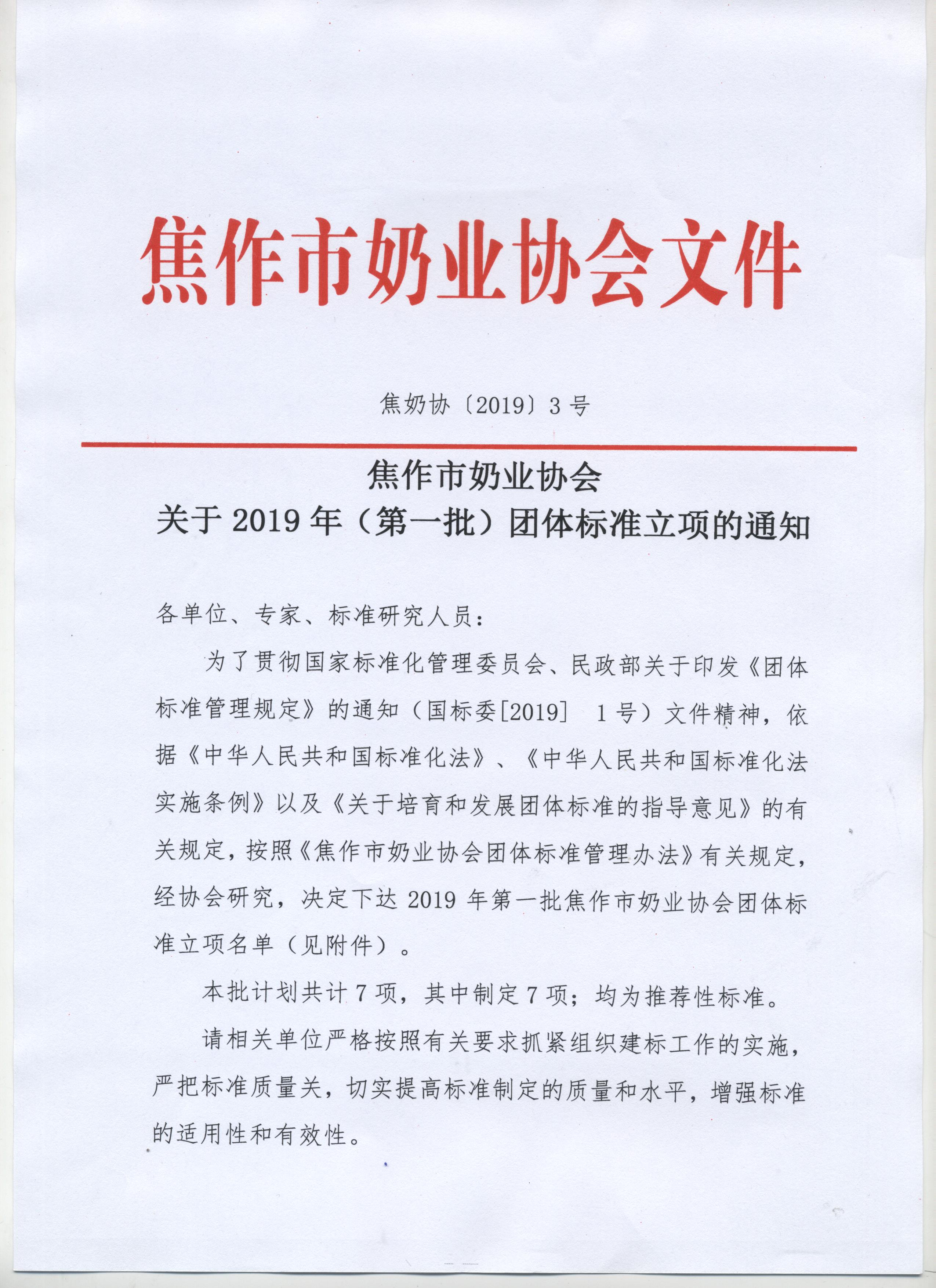 为了贯彻国家标准化管理委员会、民政部关于印发《团体标准管理规定》的通知(国标委[2019] 1号)文件精神,依据《中华人民共和国标准化法》、《中华人民共和国标准化法实施条例》以及《关于培育和发展团体标准的指导意见》的有关规定,按照《焦作市奶业协会团体标准管理办法》有关规定,经协会研究,决定下达2019年第一批焦作市奶业协会团体标准立项名单(见附件)。