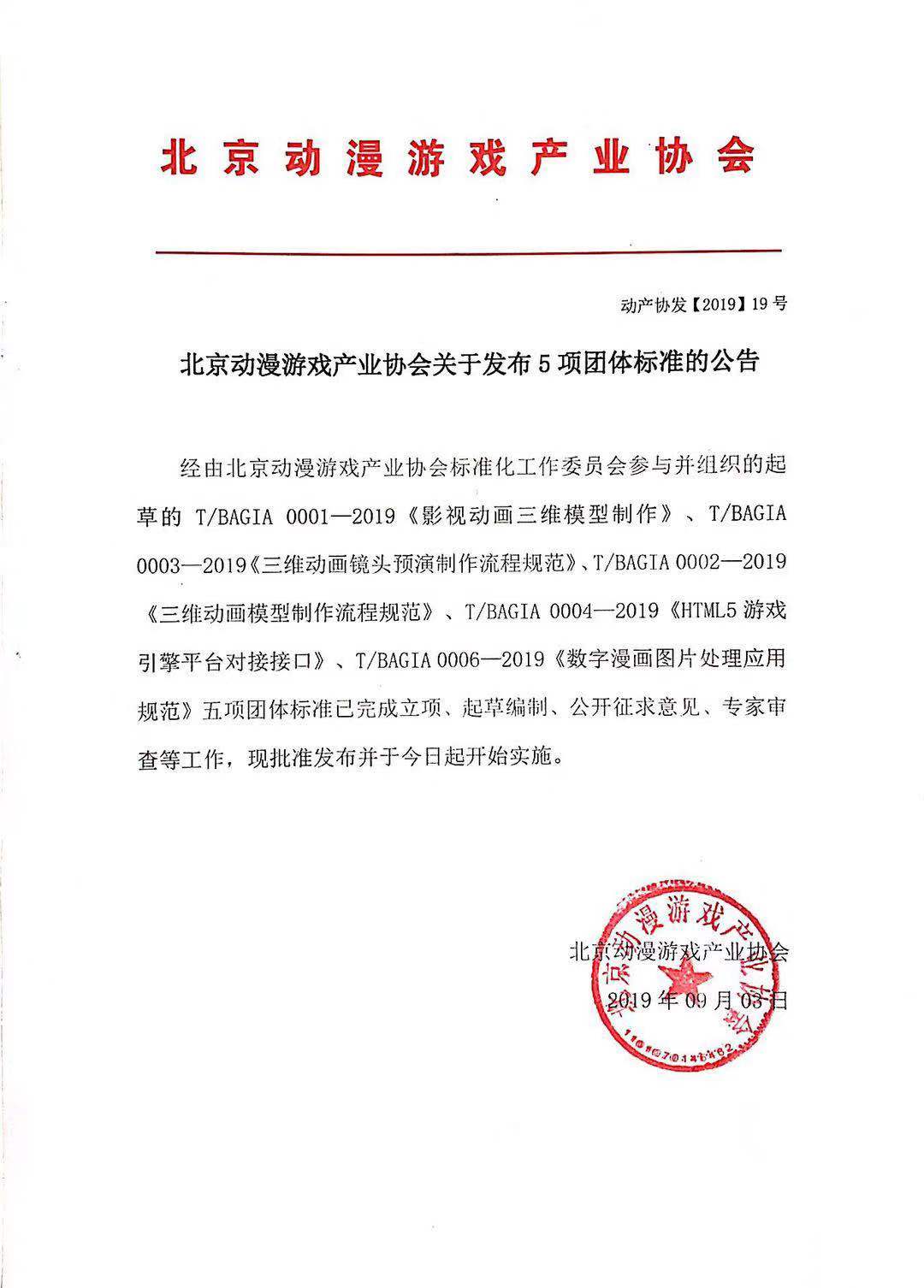 经由北京动漫游戏产业协会标准化工作委员会参与并组织起草的五项团体标准T/BAGIA 0001—2019《影视动画三维模型制作》、T/BAGIA 0002—2019《三维动画模型制作流程规范》、T/BAGIA 0003—2019《三维动画镜头预演制作流程规范》、T/BAGIA 0004—2019《HTML5游戏引擎平台对接接口》、T/BAGIA 0006—2019《数字漫画图片处理应用规范》已完成立项、起草编制、公开征求意见、专家审查等工作,现予以发布并开始实施。