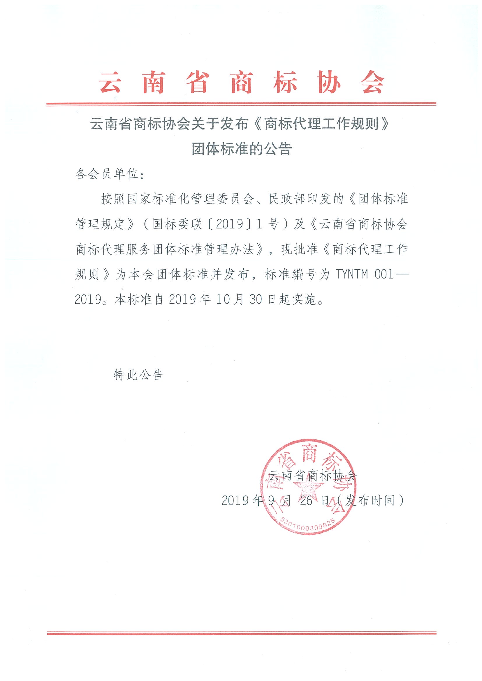 按照国家标准化管理委员会、民政部印发的《团体标准管理规定》(国标委联〔2019〕1号)及《云南省商标协会商标代理服务团体标准管理办法》,现批准《商标代理工作规则》为本会团体标准并发布,标准编号为TYNTM 001—2019。本标准自2019年10月30日起实施。