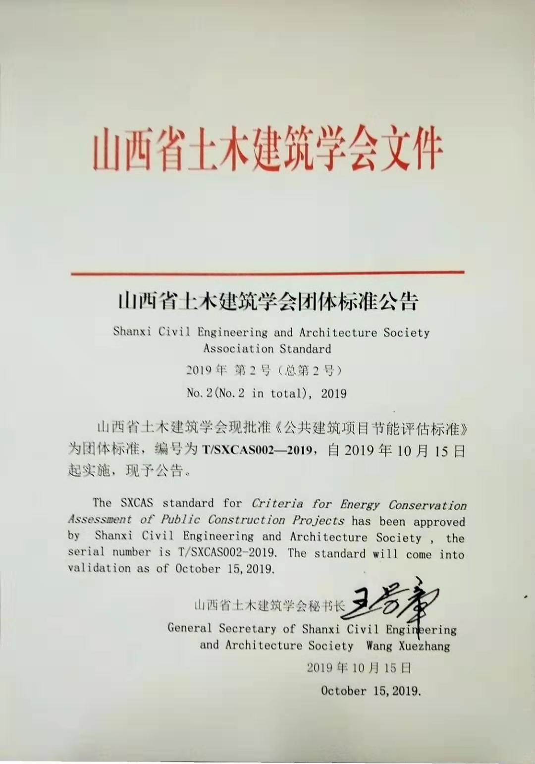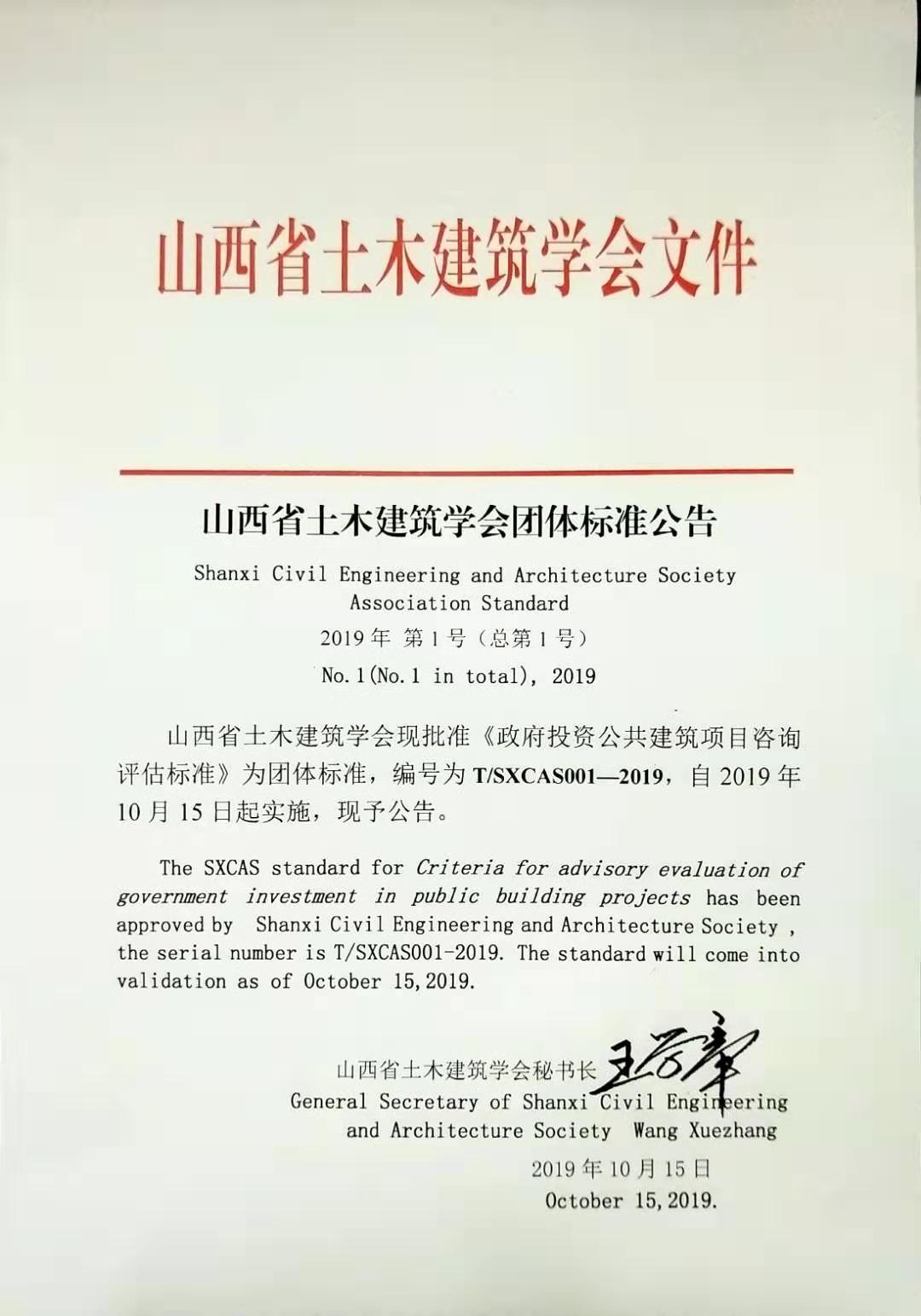 根据国家标准化管理委员会、民政部《团体标准管理规定》及《山西省土木建筑学会团体标准管理办法》和《团体标准制订、修订程序》,山西省土木建筑学会批准发布《政府投资公共建筑项目评估标准》(T/SXCAS 001—2019)、《公共建筑项目节能评估标准》(T/SXCAS 002—2019)和《企业投资建设项目评估标准》(T/SXCAS 003—2019)三项团体标准,自2019年10月25日起实施。
