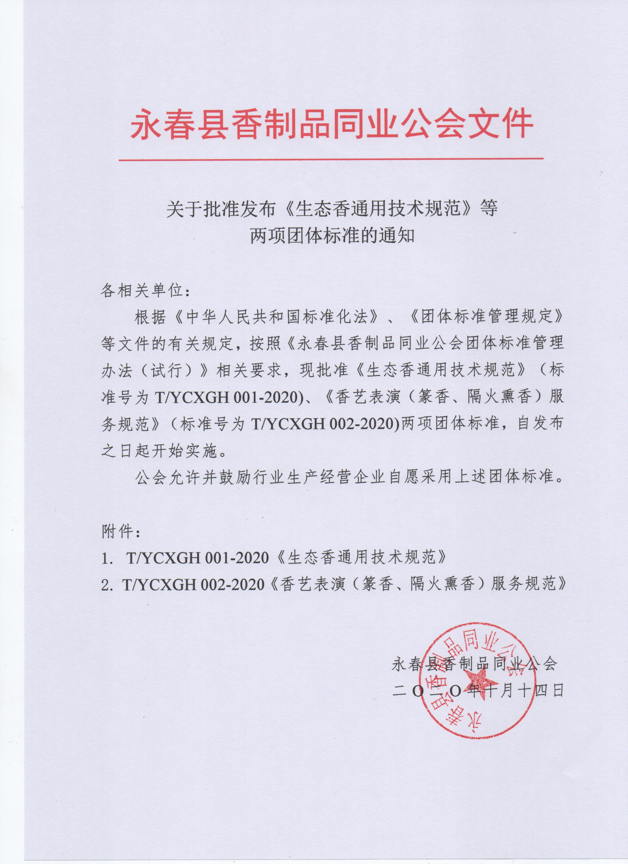 根据《中华人民共和国标准化法》、《团体标准管理规定》等文件的有关规定,按照《永春县香制品同业公会团体标准管理办法(试行)》相关要求,现批准《生态香通用技术规范》(标准号为T/YCXGH 001-2020)、《香艺表演(篆香、隔火熏香)服务规范》(标准号为T/YCXGH 002-2020)两项团体标准,自发布之日起开始实施。