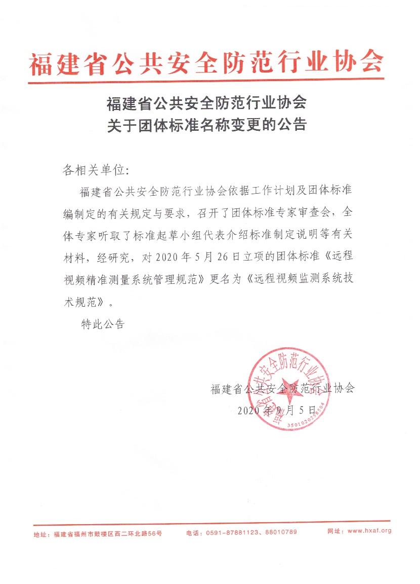 福建省公共安全防范行业协会依据工作计划及团体标准编制定的有关规定与要求,召开了团体标准专家审查会,全体专家听取了标准起草小组代表介绍标准制定说明等有关材料,经研究,对2020年5月26日立项的团体标准《远程视频精准测量系统管理规范》更名为《远程视频监测系统技术规范》。