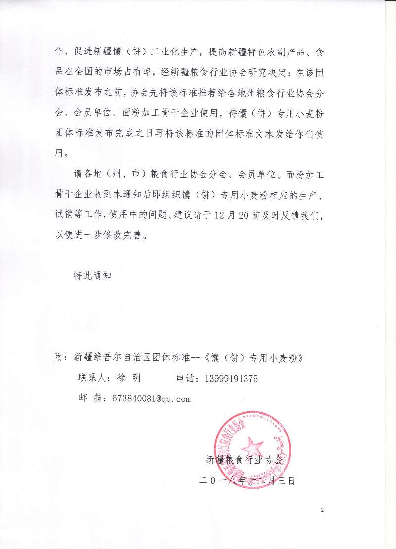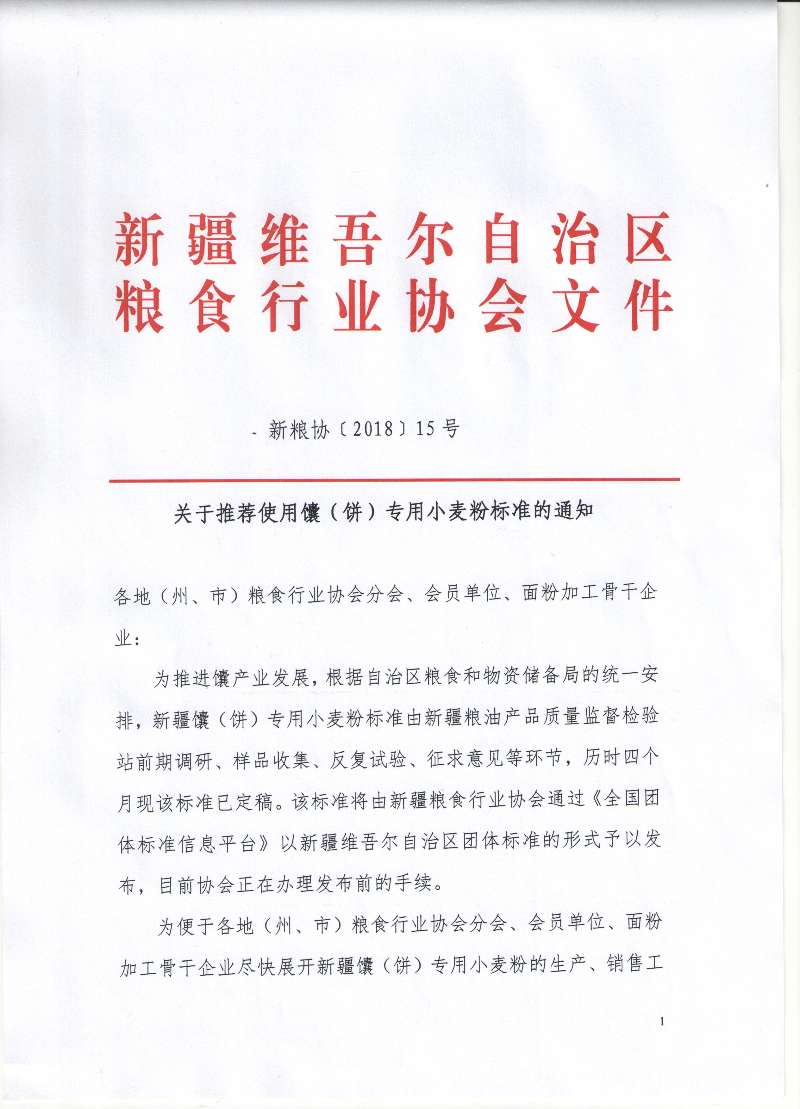 为便于各地(州、市)粮食行业协会分会、会员单位、面粉加工骨干企业尽快展开新疆馕(饼)专用小麦粉的生产、销售工作,促进新疆馕(饼)工业化生产,提高新疆特色农副产品、食品在全国的市场占有率,经新疆粮食行业协会研究决定:在该团体标准发布之前,协会先将该标准推荐给各地州粮食行业协会分会、会员单位、面粉加工骨干企业使用,待馕(饼)专用小麦粉团体标准发布完成之日再将该标准的团体标准文本发给你们使用。