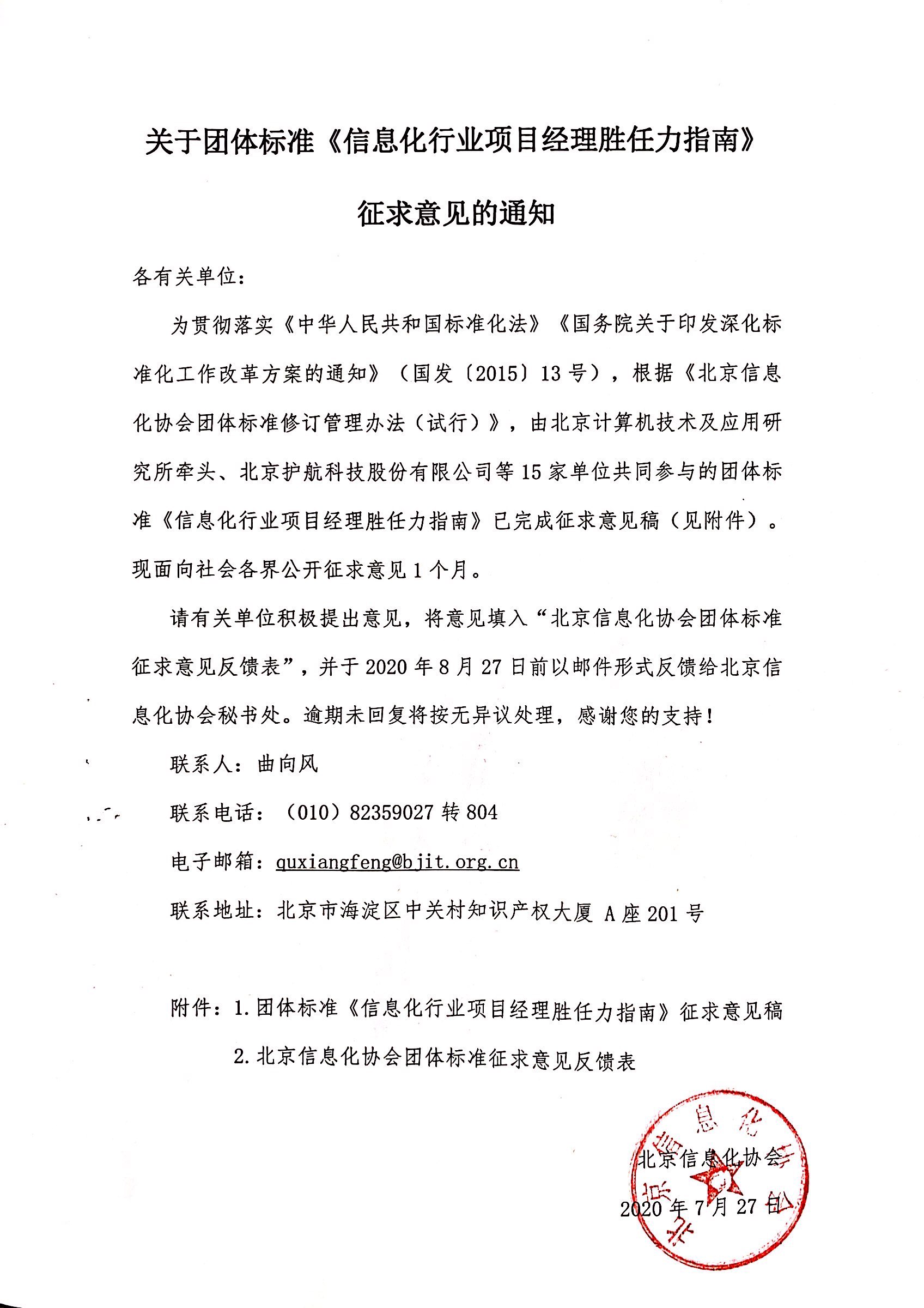 为贯彻落实《中华人民共和国标准化法》《国务院关于印发深化标准化工作改革方案的通知》(国发〔2015〕13号),根据《北京信息化协会团体标准修订管理办法(试行)》,由北京计算机技术及应用研究所牵头、北京护航科技股份有限公司等15家单位共同参与的团体标准《信息化行业项目经理胜任力指南》已完成征求意见稿(见附件)。现面向社会各界公开征求意见1个月。