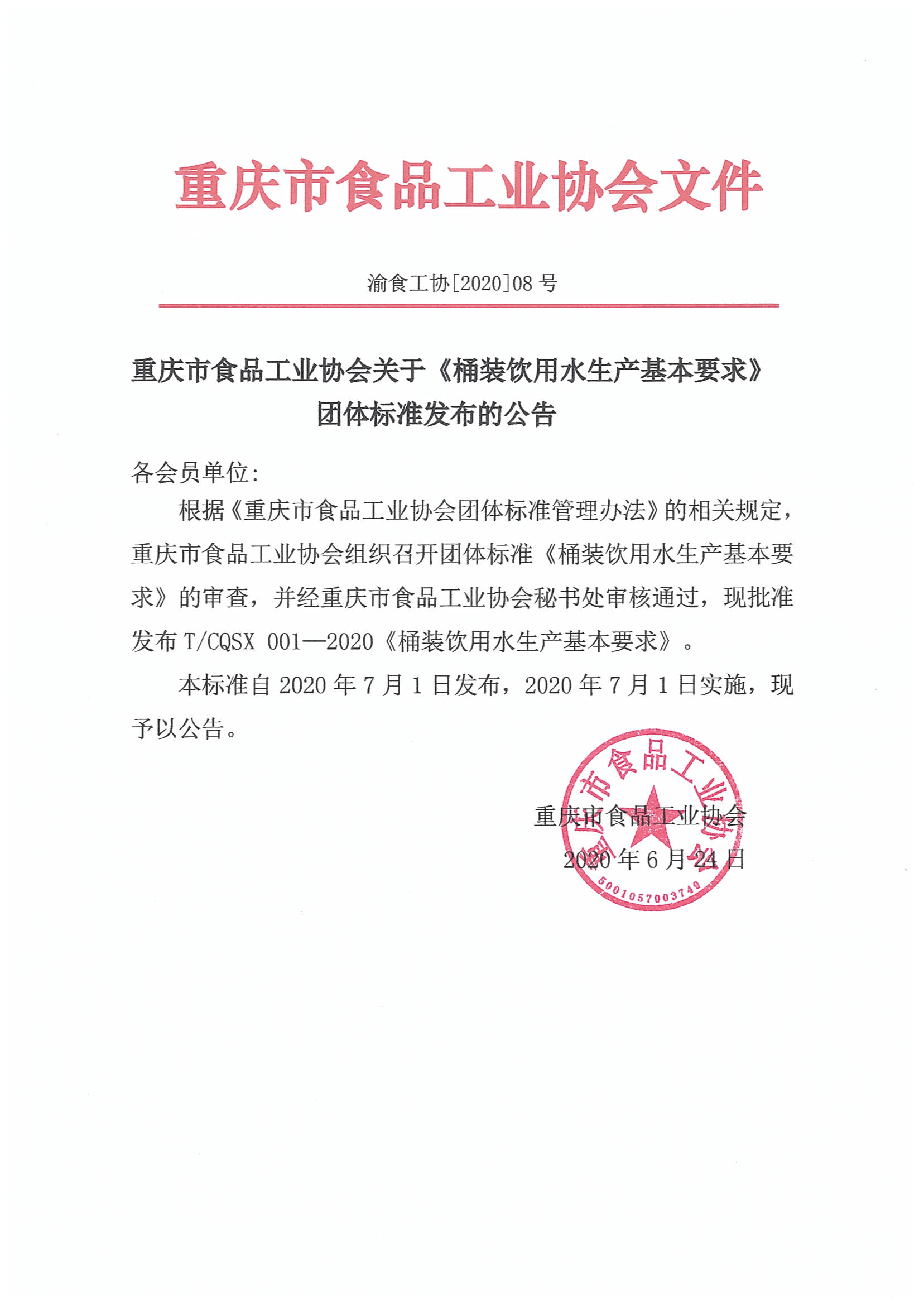 根据《重庆市食品工业协会团体标准管理办法》的相关规定,重庆市食品工业协会组织召开团体标准《桶装饮用水生产基本要求》的审查,并经重庆市食品工业协会秘书处审核通过,现批准发布T/CQSX 001—2020《桶装饮用水生产基本要求》。本标准自2020年7月1日发布,2020年7月1日实施,现予以公告。