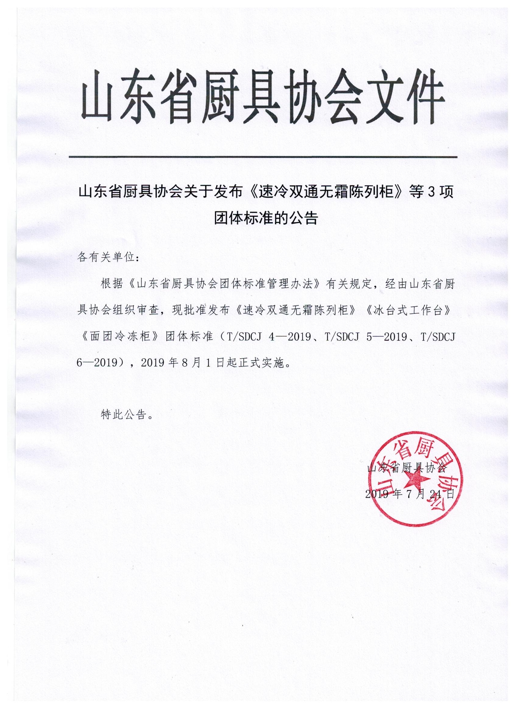 根据《山东省厨具协会团体标准管理办法》有关规定,经由山东省厨具协会组织审查,现批准发布《速冷双通无霜陈列柜》《冰台式工作台》《面团冷冻柜》团体标准(T/SDCJ 4—2019、T/SDCJ 5—2019、T/SDCJ 6—2019),2019年8月1日起正式实施。