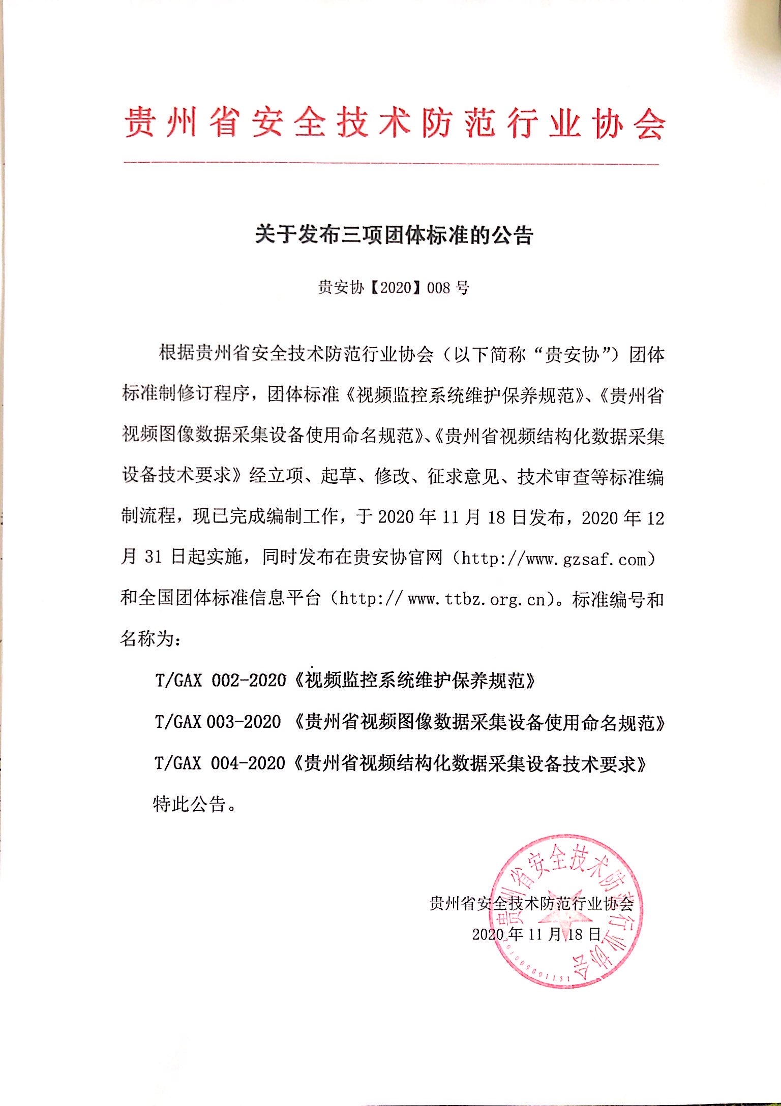 根据贵州省安全技术防范行业协会(以下简称“贵安协”)团体标准制修订程序,团体标准《视频监控系统维护保养规范》、《贵州省视频图像数据采集设备使用命名规范》、《贵州省视频结构化数据采集设备技术要求》经立项、起草、修改、征求意见、技术审查等标准编制流程,现已完成编制工作,于2020年11月18日发布,2020年12月31日起实施,同时发布在贵安协官网(http://www.gzsaf.com)和全国团体标准信息平台(http:// www.ttbz.org.cn)。标准编号和名称为: