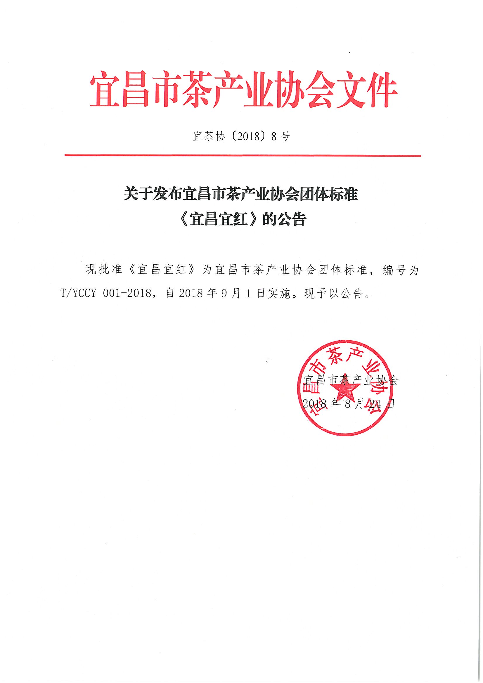 现批准《宜昌宜红》为宜昌市茶产业协会团体标准,编号为T/YCCY 001-2018,自2018年9月1日实施。现予以公告。