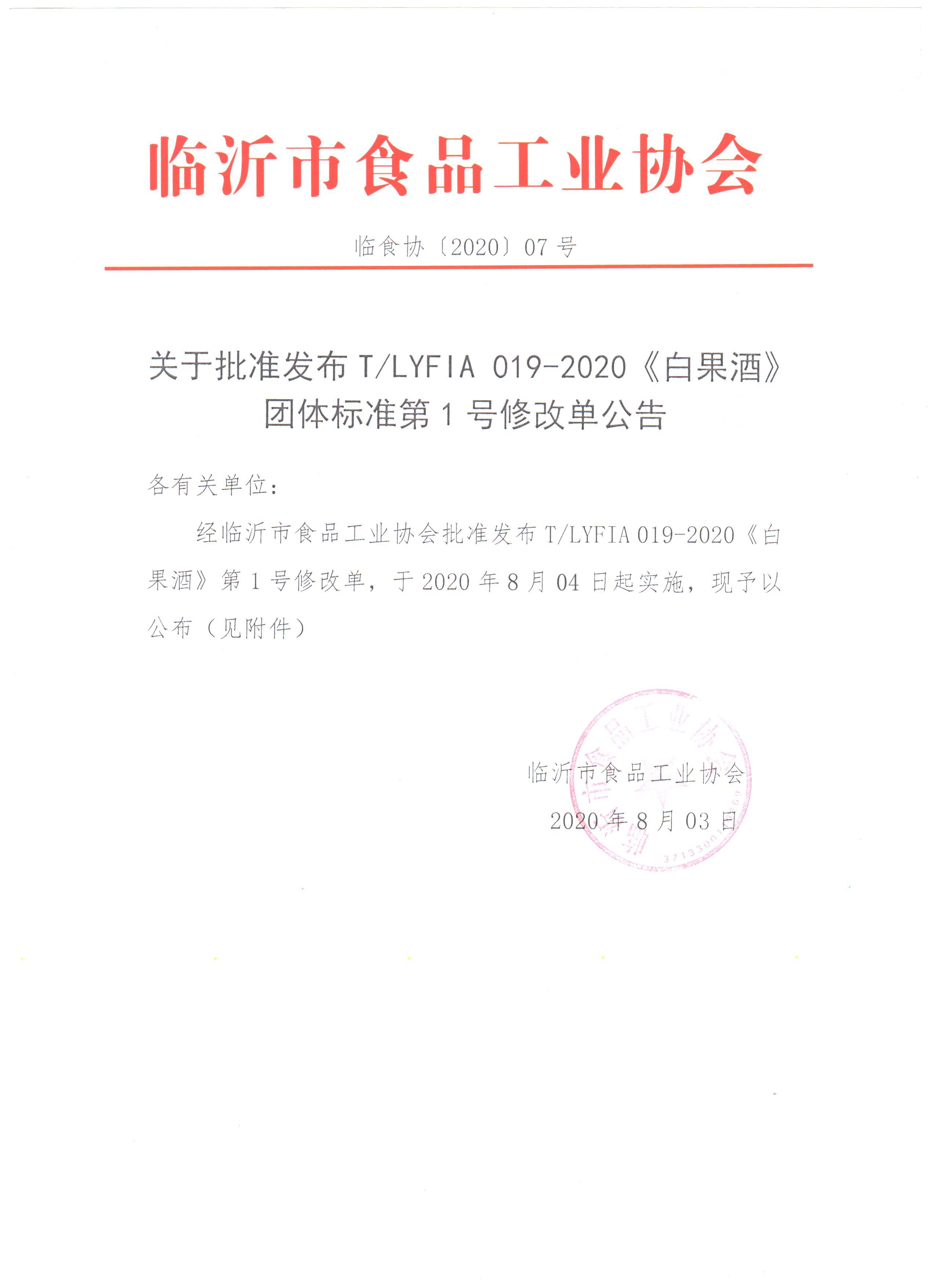 T/LYFIA 019-2020《白果酒》团体标准第1号修改单经我团体审查批准发布。建议该修改单于2020年08月04日起实施。