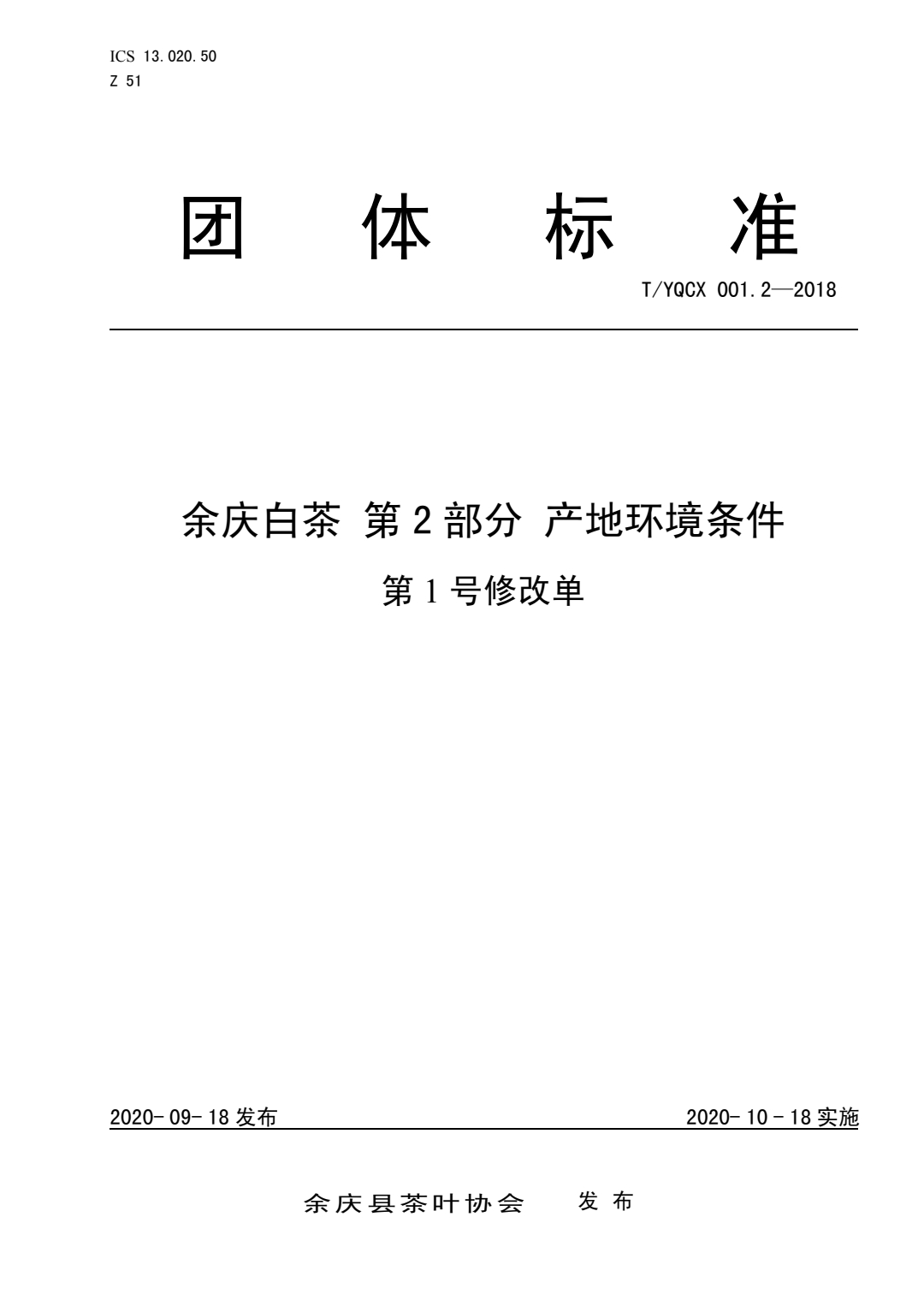 T/YQCX 001.2-2018《余庆白茶 第2部分 产地环境条件》团体标准第1号修改单经我团体审查批准发布。建议该修改单于2020年10月18日起实施。 修改单见附件。