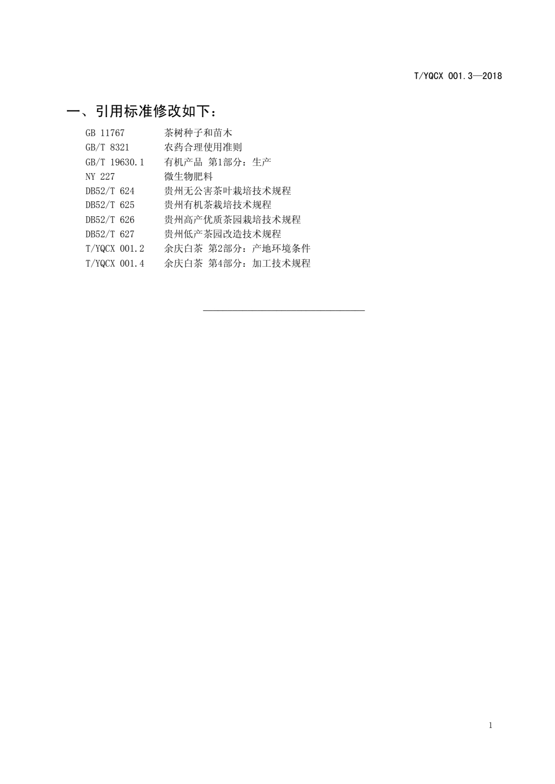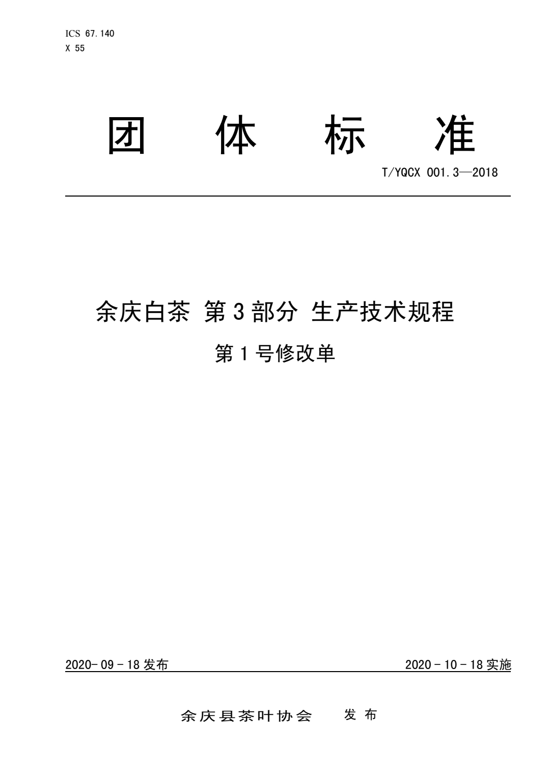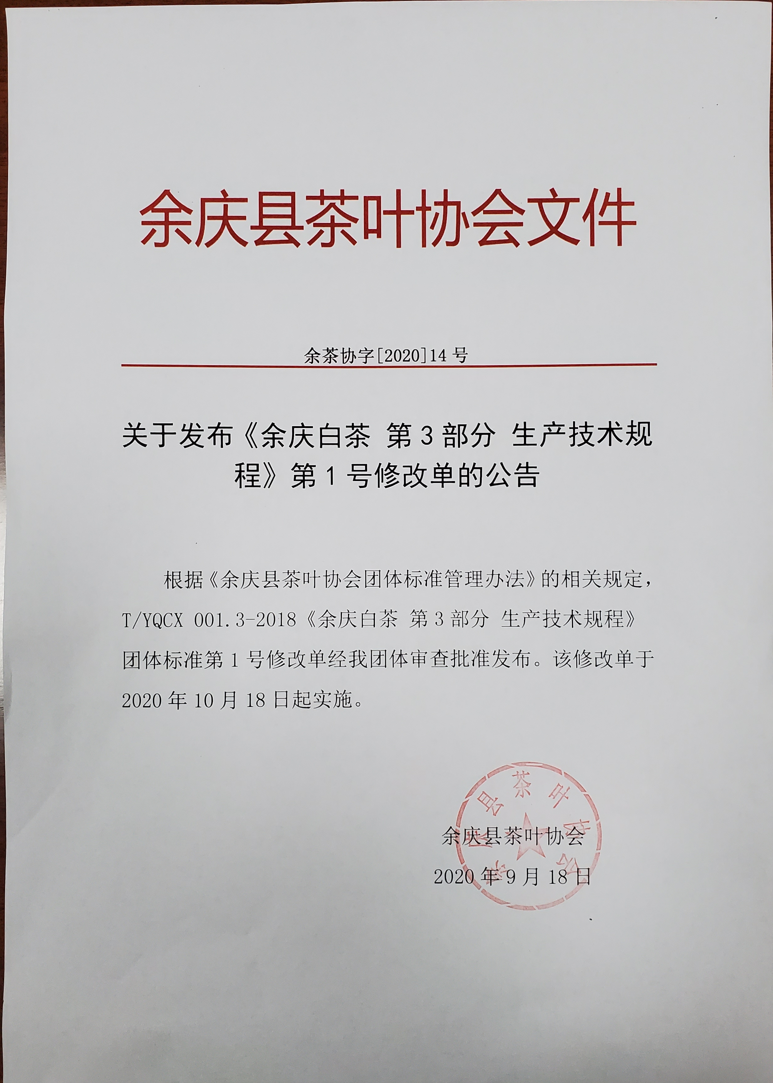 T/YQCX 001.3-2018《余庆白茶 第3部分 生产技术规程》团体标准第1号修改单经我团体审查批准发布。该修改单于2020年10月18日起实施。 修改单见附件。