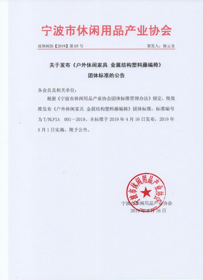 根据《宁波市休闲用品产业协会团体标准管理办法》规定,现批准发布《户外休闲家具 金属结构塑料藤编椅》团体标准,标准编号为T/NLPIA 001—2019。本标准于2019年4月16日发布,2019年5月1日起实施。现予公告。