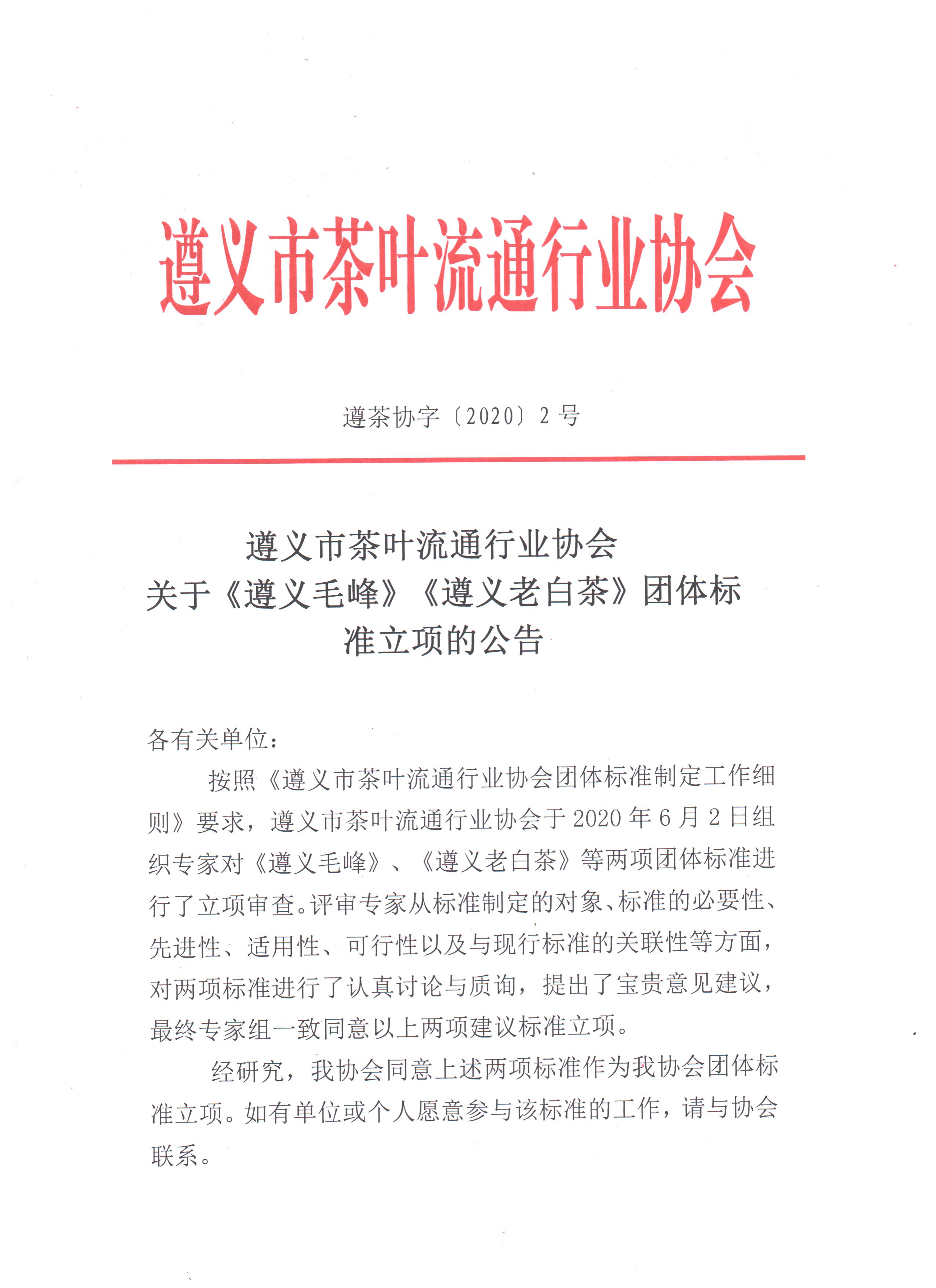 按照《遵义市茶叶流通行业协会团体标准制定工作细则》要求,遵义市茶叶流通行业协会于2020年6月2日组织专家对《遵义毛峰》、《遵义老白茶》等两项团体标准进行了立项审查。评审专家从标准制定的对象、标准的必要性、先进性、适用性、可行性以及与现行标准的关联性等方面,对两项标准进行了认真讨论与质询,提出了宝贵意见建议,最终专家组一致同意以上两项建议标准立项。