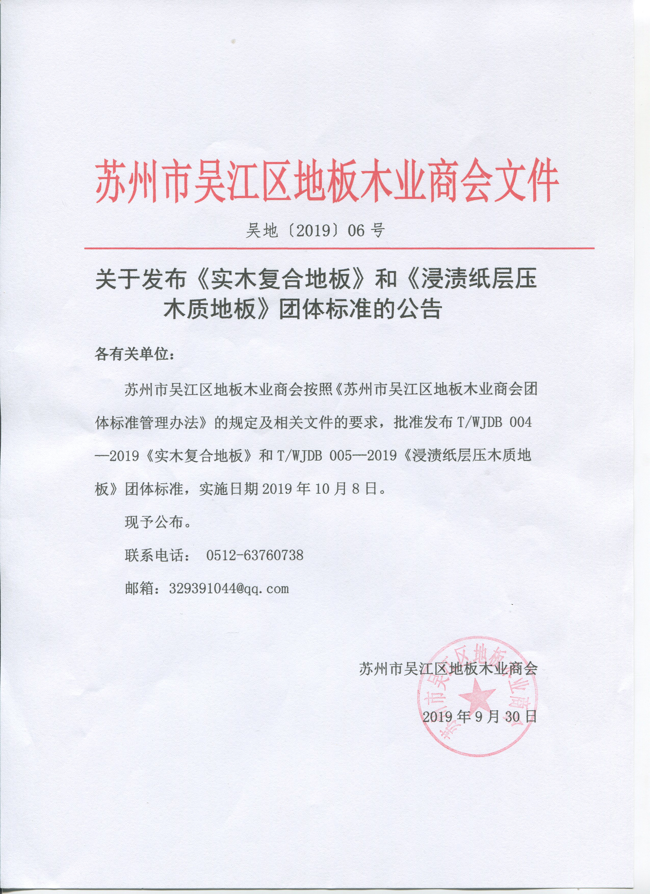 苏州市吴江区地板木业商会按照《苏州市吴江区地板木业商会团体标准管理办法》的规定及相关文件的要求,批准发布T/WJDB 004—2019《实木复合地板》和T/WJDB 005—2019《浸渍纸层压木质地板》团体标准,实施日期2019年10月8日。