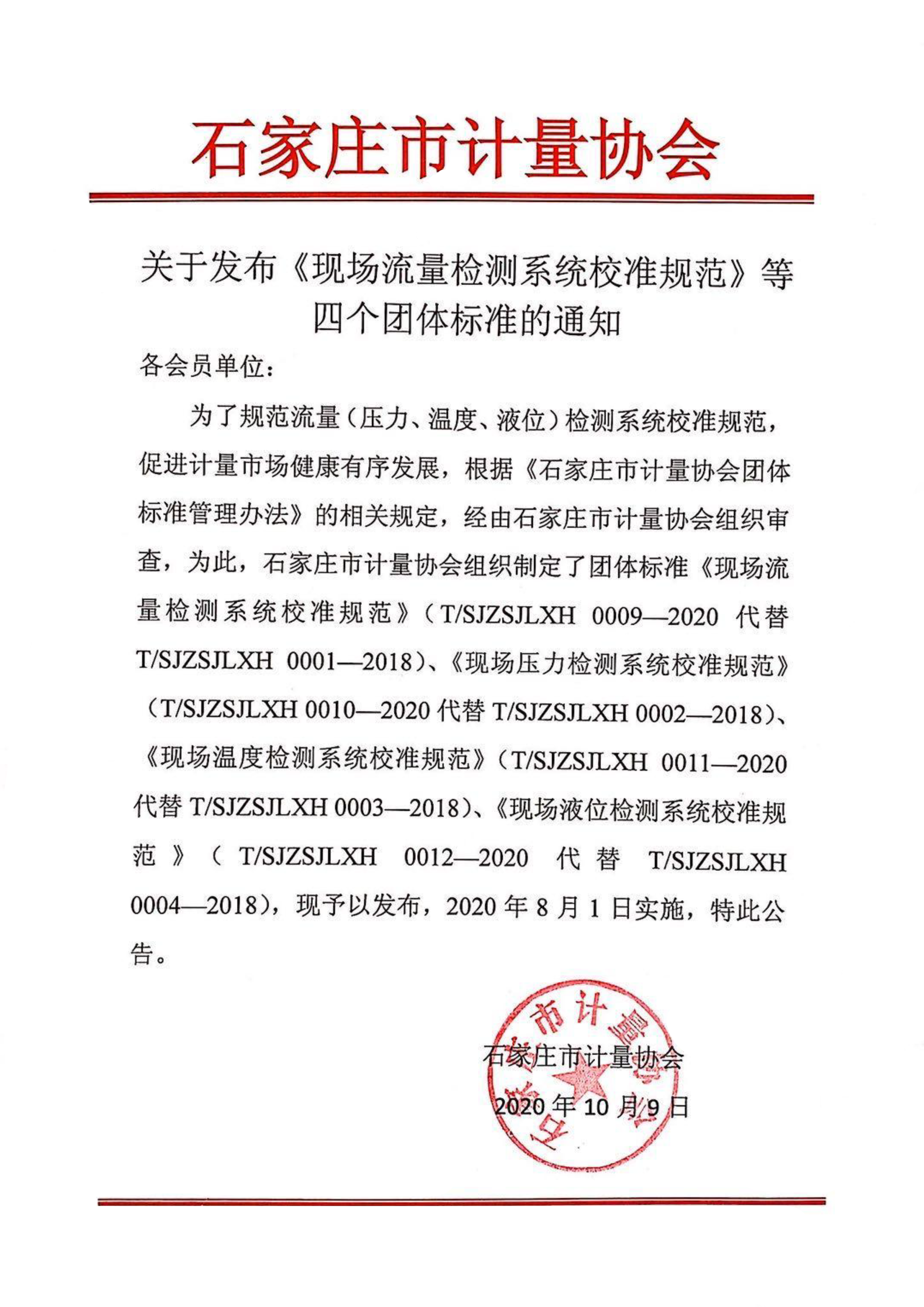 为了规范流量(压力、温度、液位)检测系统校准规范,促进计量市场健康有序发展,根据《石家庄市计量协会团体标准管理办法》的相关规定,经由石家庄市计量协会组织审查,为此,石家庄市计量协会组织制定了团体标准《现场流量检测系统校准规范》(T/SJZSJLXH 0009—2020代替T/SJZSJLXH 0001—2018)、《现场压力检测系统校准规范》(T/SJZSJLXH 0010—2020代替T/SJZSJLXH 0002—2018)、《现场温度检测系统校准规范》(T/SJZSJLXH 0011—2020代替T/SJZSJLXH 0003—2018)、《现场液位检测系统校准规范》(T/SJZSJLXH 0012—2020代替T/SJZSJLXH 0004—2018),现予以发布,2020年8月1日实施,特此公告。