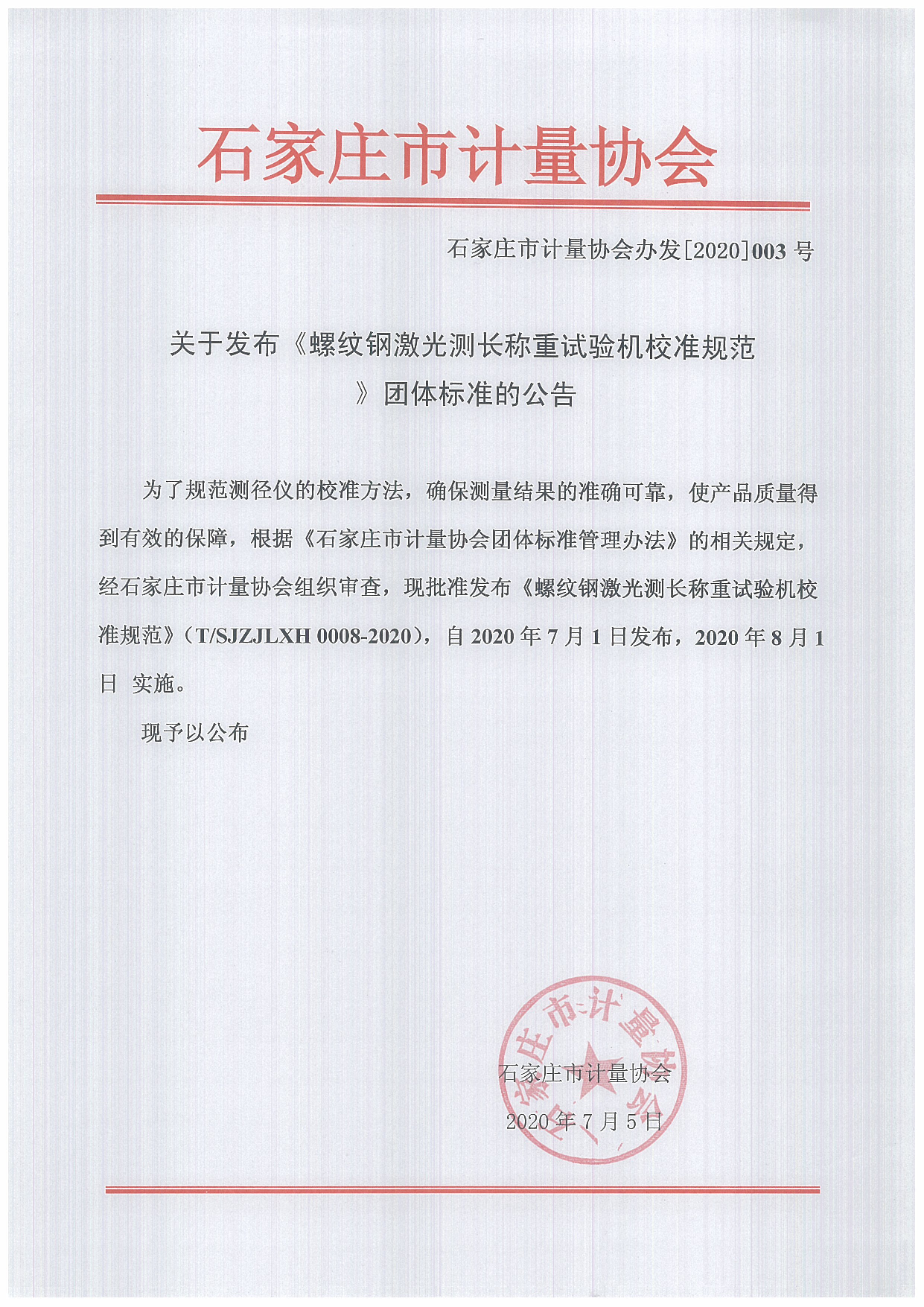 为了规范测径仪的校准方法,确保测量结果的准确可靠,使产品质量得到有效的保障,根据《石家庄市计量协会团体标准管理办法》的相关规定,经石家庄市计量协会组织审查,现批准发布《螺纹钢激光测长称重试验机校准规范》(T/SJZJLXH 0008-2020),自2020年7月1日发布,2020年8月1日 实施。