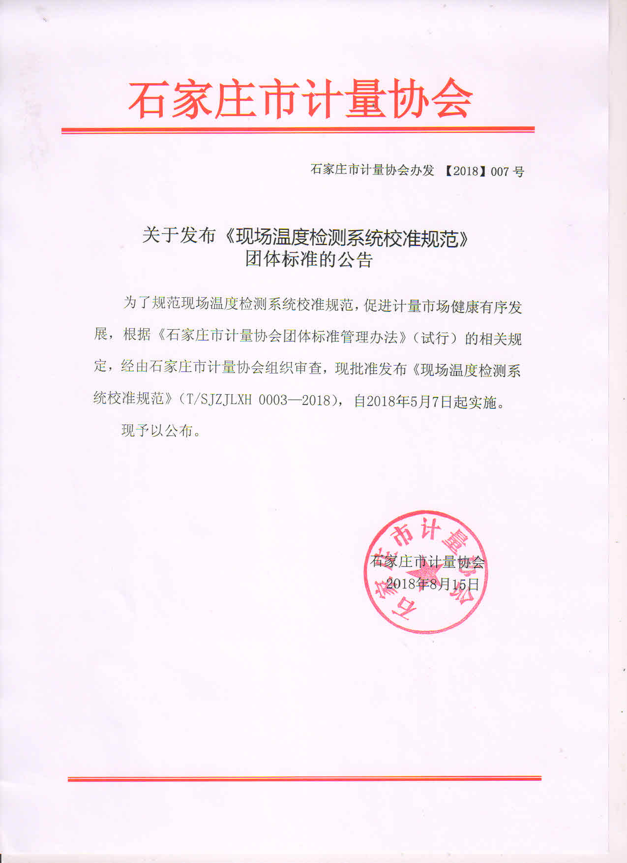 为了规范现场温度检测系统校准规范,促进计量市场健康有序发展,根据《石家庄市计量协会团体标准管理办法》(试行)的相关规定,经由石家庄市计量协会组织审查,现批准发布《现场温度检测系统校准规范》(T/SJZJLXH 0003—2018),自2018年5月7日起实施。