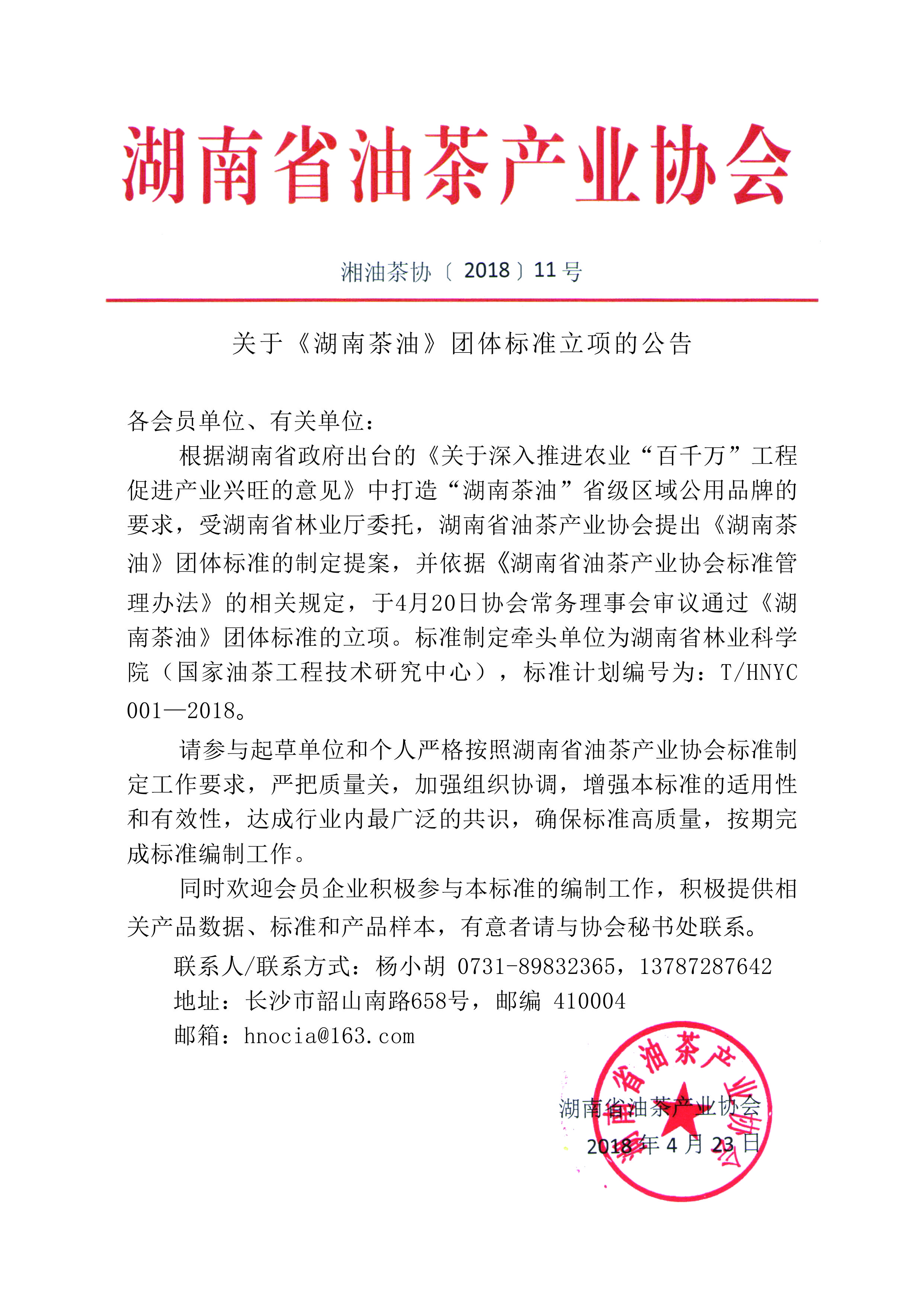 根据湖南省政府出台的《关于深入推进农业“百千万”工程促进产业兴旺的意见》中打造“湖南茶油”省级区域公用品牌的要求,受湖南省林业厅委托,湖南省油茶产业协会提出《湖南茶油》团体标准的制定提案,并依据《湖南省油茶产业协会标准管理办法》的相关规定,于4月20日协会常务理事会审议通过《湖南茶油》团体标准的立项。标准制定牵头单位为湖南省林业科学院(国家油茶工程技术研究中心),标准计划编号为:T/HNYC 001—2018。