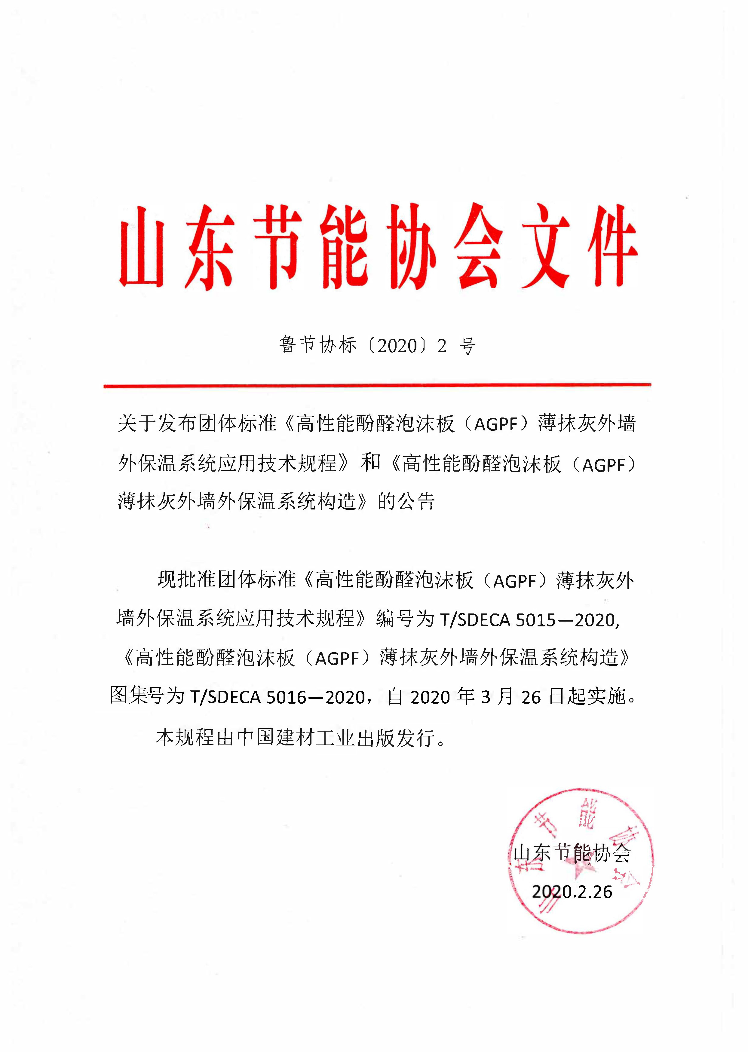 根据《山东节能协会团体标准管理办法》的规定,山东节能协会批准《高性能酚醛泡沫板(AGPF)薄抹灰外墙外保温系统应用技术规程》和《高性能酚醛泡沫板(AGPF)薄抹灰外墙外保温系统构造》团体标准,标准自2020年3月26日起实施。