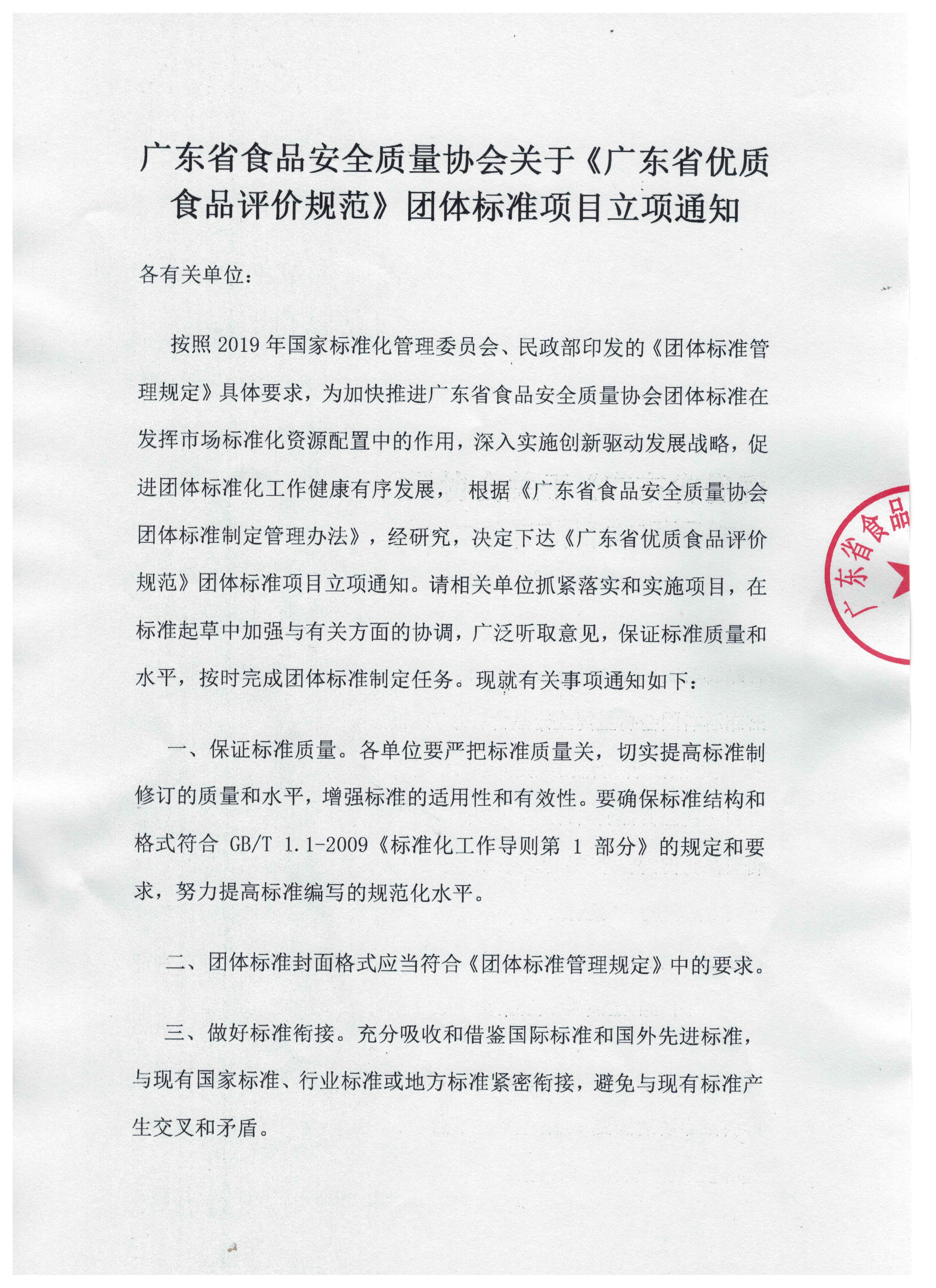按照2019年国家标准化管理委员会、民政部印发的《团体标准管理规定》具体要求,为加快推进广东省食品安全质量协会团体标准在发挥市场标准化资源配置中的作用,深入实施创新驱动发展战略,促进团体标准化工作健康有序发展, 根据《广东省食品安全质量协会团体标准制定管理办法》,经研究,决定下达《广东省优质食品评价规范》团体标准项目立项通知。请相关单位抓紧落实和实施项目,在标准起草中加强与有关方面的协调,广泛听取意见,保证标准质量和水平,按时完成团体标准制定任务。现就有关事项通知如下: