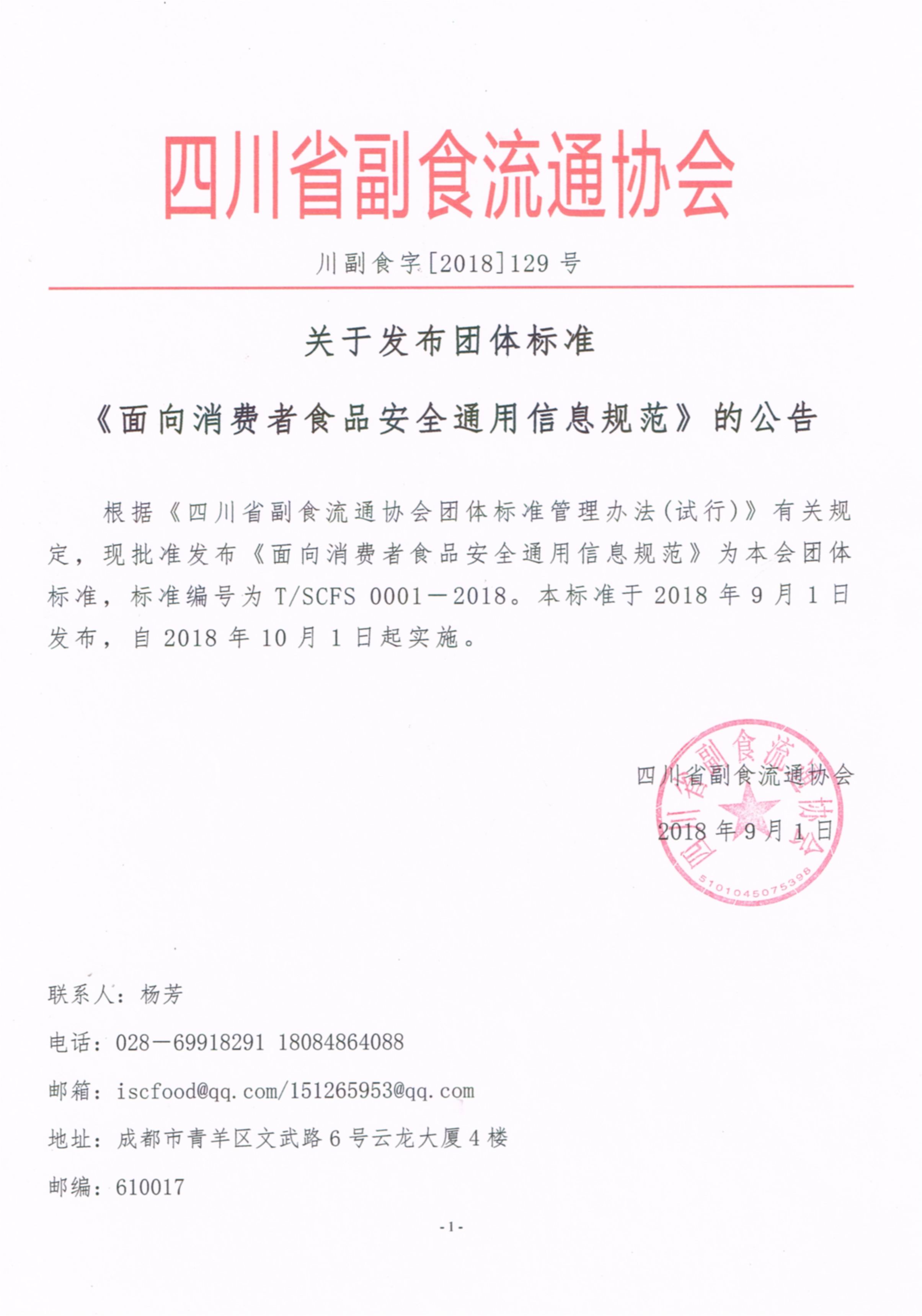 根据《四川省副食流通协会团体标准管理办法(试行)》有关规定,现批准发布《面向消费者食品安全通用信息规范》为本会团体标准,标准编号为T/SCFS 0001-2018。本标准于2018年9月1日发布,自2018年10月1日起实施。