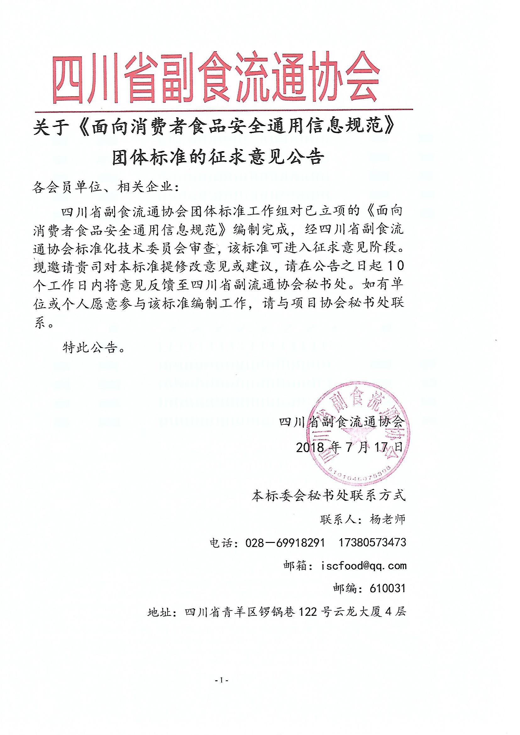 四川省副食流通协会团体标准工作组对已立项的《面向消费者食品安全通用信息规范》编制完成,经四川省副食流通协会标准化技术委员会审查,该标准可进入征求意见阶段。现邀请贵司对本标准提修改意见或建议,请在公告之日起10个工作日内将意见反馈至四川省副流通协会秘书处。如有单位或个人愿意参与该标准编制工作,请与项目协会秘书处联系。