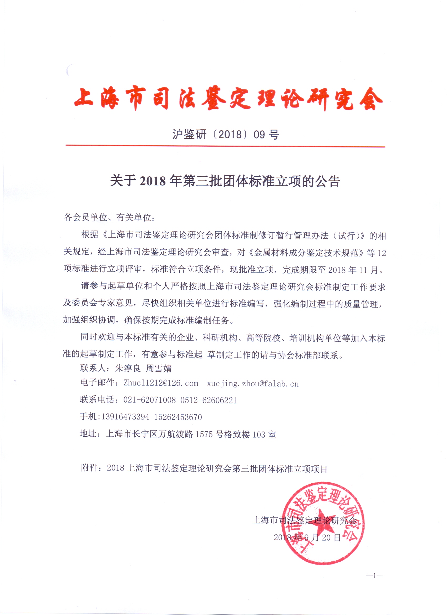 根据《上海市司法鉴定理论研究会团体标准制修订暂行管理办法(试行)》的相关规定,经上海市司法鉴定理论研究会审查,对《金属材料成分鉴定技术规范》等12项标准进行立项评审,标准符合立项条件,现批准立项,完成期限至2018年11月。