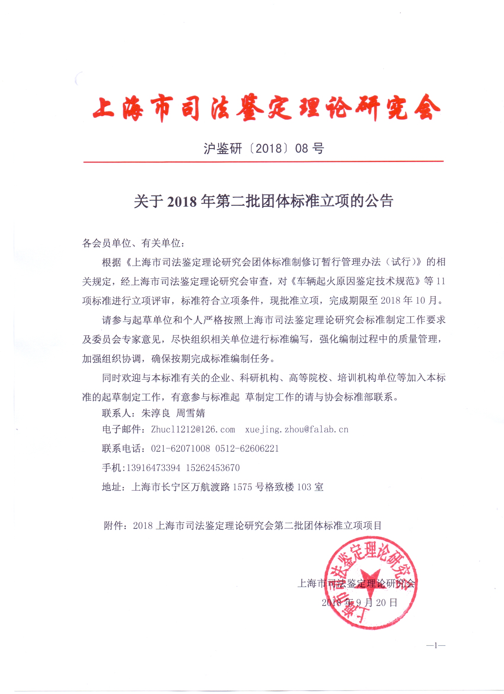 根据《上海市司法鉴定理论研究会团体标准制修订暂行管理办法(试行)》的相关规定,经上海市司法鉴定理论研究会审查,对《车辆起火原因鉴定技术规范》等11项标准进行立项评审,标准符合立项条件,现批准立项,完成期限至2018年10月。