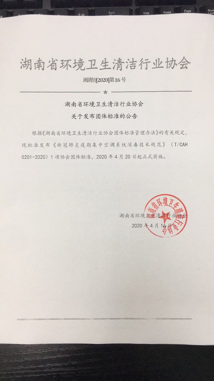 根据《湖南省环境卫生清洁行业协会团体标准管理办法》的有关规定,现批准发布《新冠肺炎疫期集中空调系统消毒技术规范》(T/CAH 0201-2020)1 项协会团体标准,2020 年 4 月 20 日起正式实施。